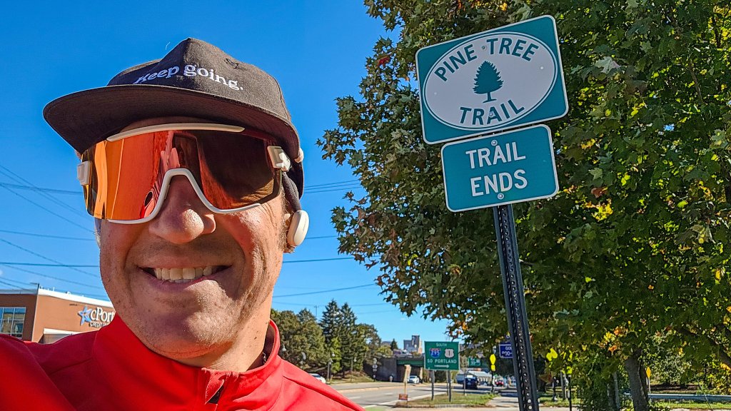 Jeremy Chapman, of Mechanic Falls, on Oct. 9 next to the sign on Forest Avenue in Portland that marks the end of the Pine Tree Trail. (Courtesy of Jeremy Chapman)