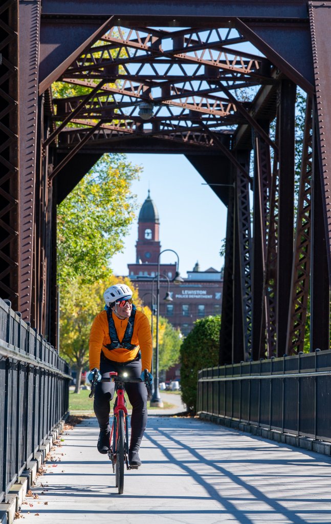Jeremy Chapman bikes across the John Jenkins Footbridge between Lewiston and Auburn on Oct. 9 while on the last leg of his 400-mile “reconnaissance ride” of the newly resurrected Pine Tree Trail between Fort Kent and Portland. (Russ Dillingham/Staff Photographer)