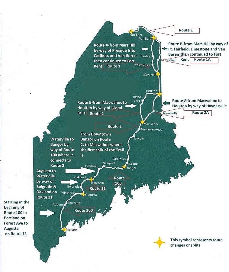 A map of the Pine Tree Trail from Fort Kent to Portland. (Courtesy of Pine Tree Trail)
