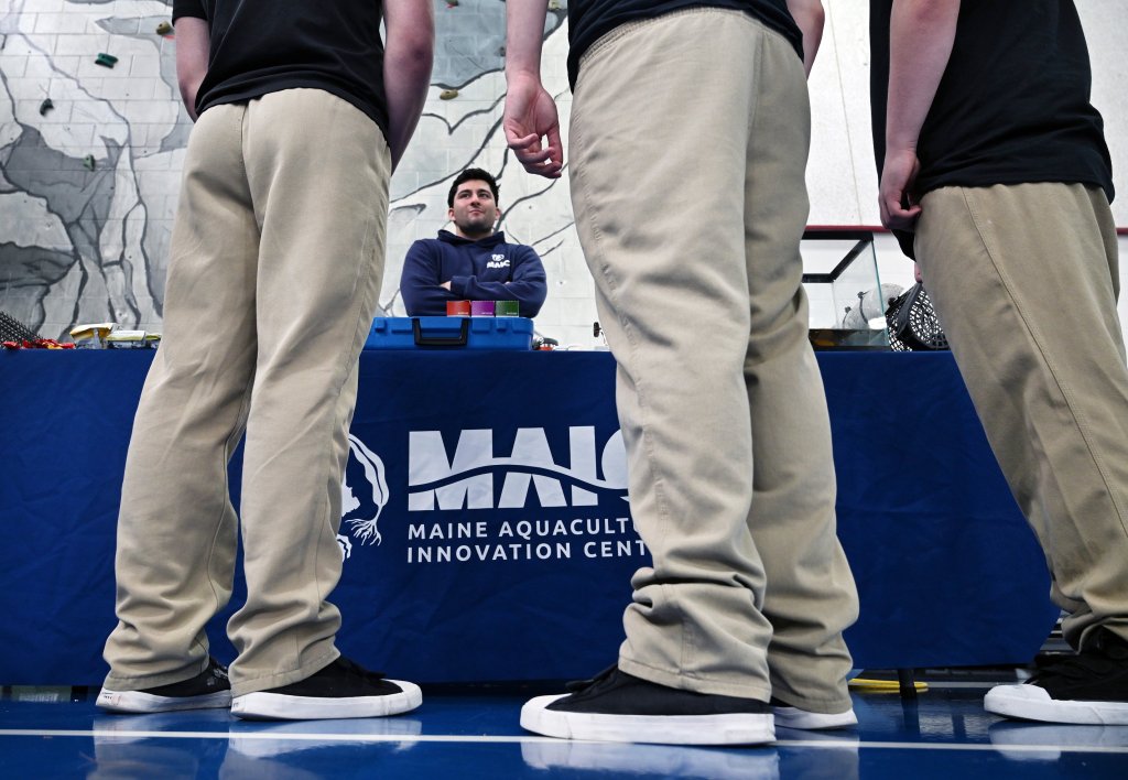 Antoine Mier with the Maine Aquaculture Innovation Center talks with residents at Long Creek Youth Development Center during the day of trades on Tuesday. (Shawn Ouellette/Staff Photographer)