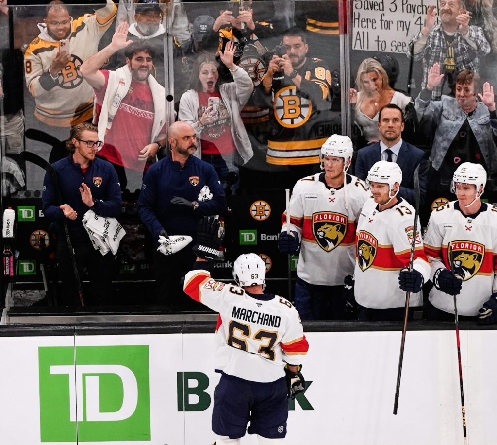There was a mixed reaction when the Panthers scored on the power play — a goal that first appeared to be Marchand’s but was credited to Mackie Samoskevich; Marchand picked up his first assist.