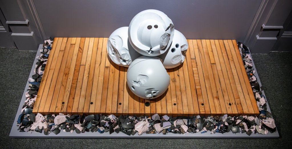 At the center of the installation are four bowling balls and six billiard balls painted white. They are broken and partially shattered with pieces missing. Smaller shards frame the balls. This references not feeling whole after losing someone close, he said.