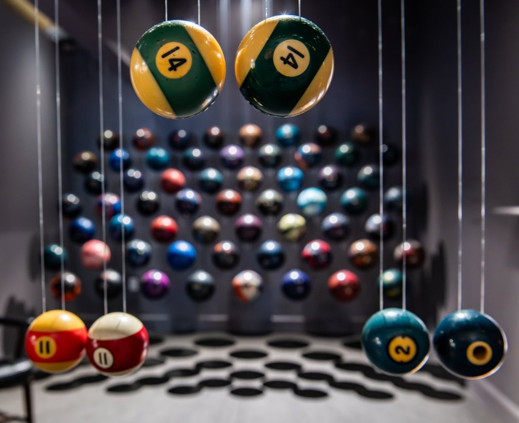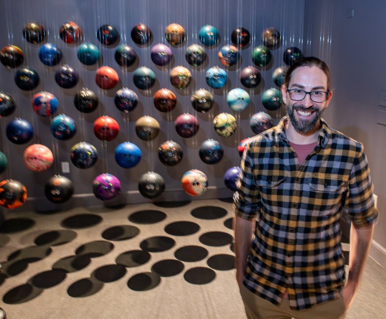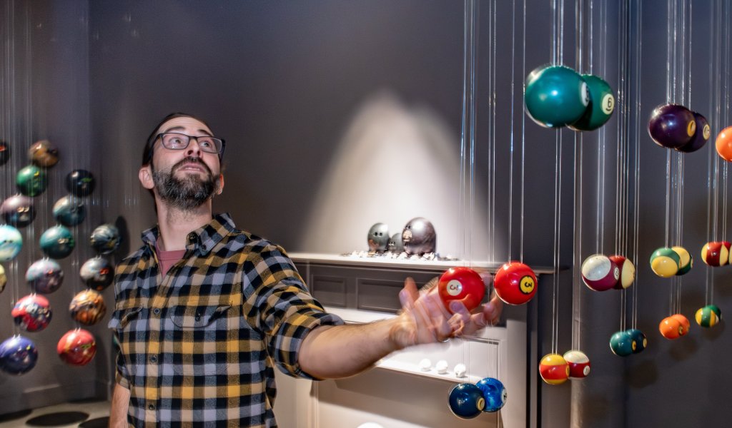 “We’re used to seeing bowling balls and billiard balls in these places of recreation,” he said. “They’re always moving, colliding, making this sort of very familiar sound. You can always picture what a bowling alley sounds like or what a pool hall sounds like based on the collision of these objects. So by contrast, I was going to effectively freeze them in space, freeze them in the air, make them silent, make them still.”