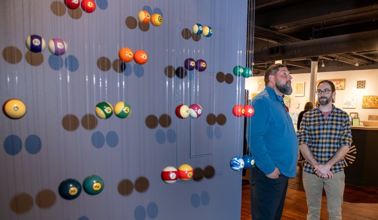 It is the first time he has developed an art piece for such a heavy topic, he said. The installation features 59 bowling balls from Just-In-Time Recreation and 58 billiard balls from Schemengees Bar and Grille.