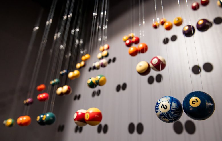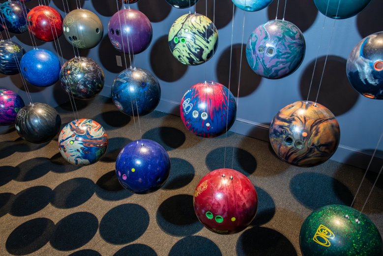 “We’re used to seeing bowling balls and billiard balls in these places of recreation,” he said. “They’re always moving, colliding, making this sort of very familiar sound. You can always picture what a bowling alley sounds like or what a pool hall sounds like based on the collision of these objects. So by contrast, I was going to effectively freeze them in space, freeze them in the air, make them silent, make them still.”