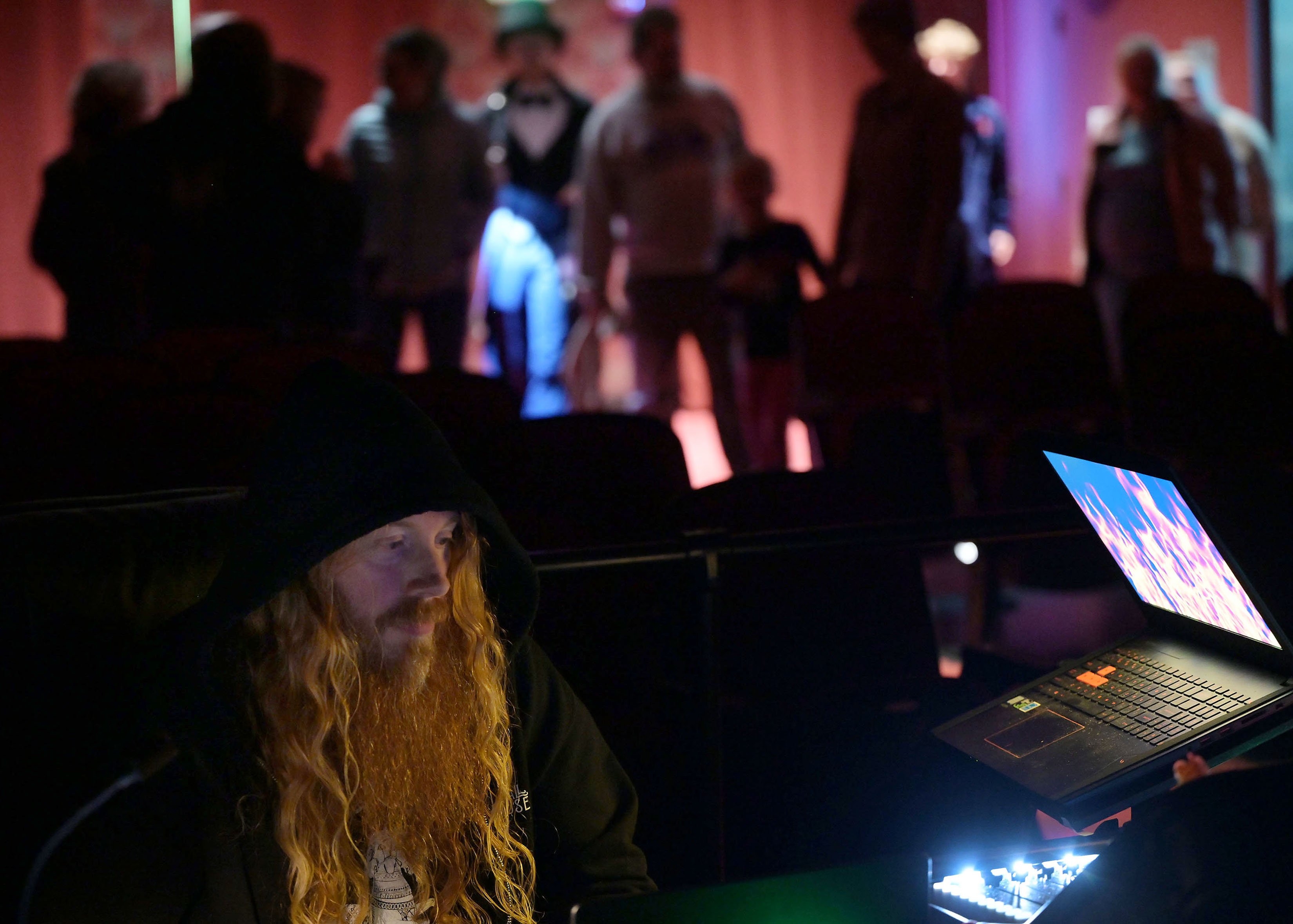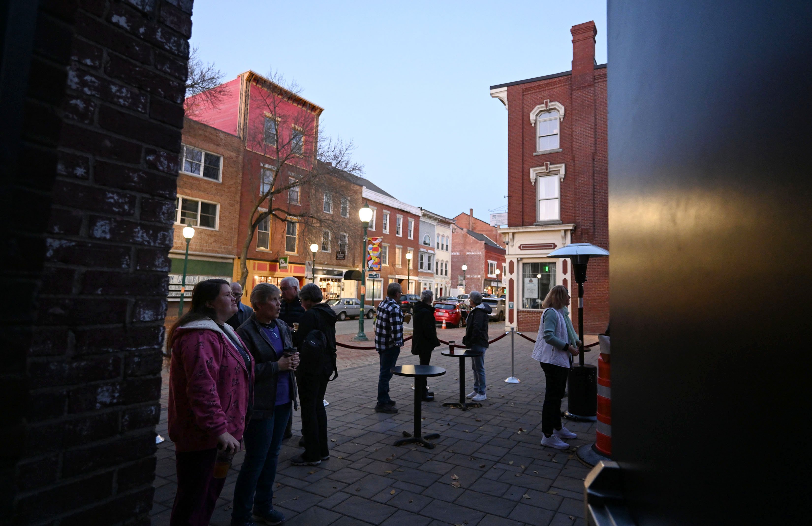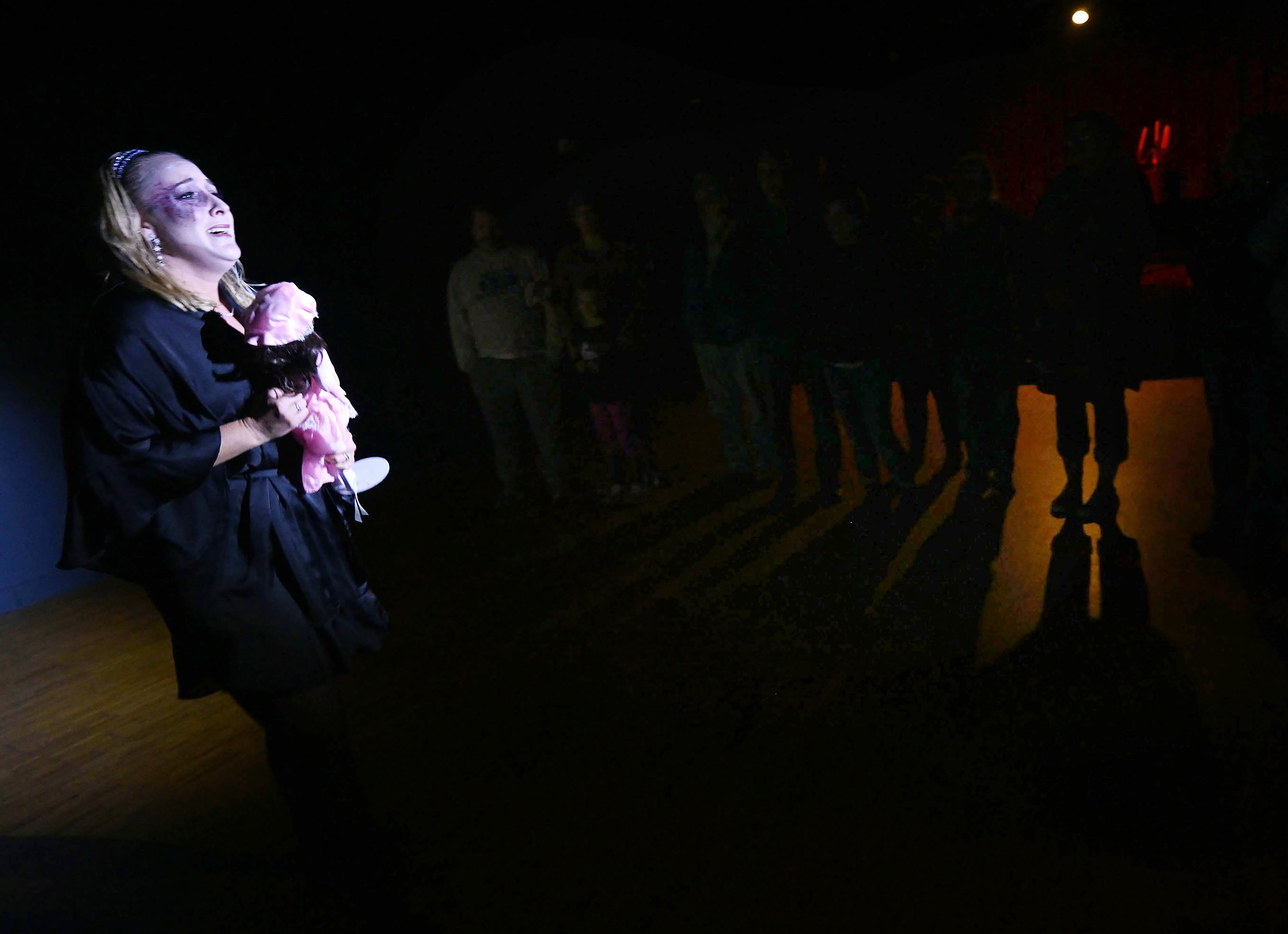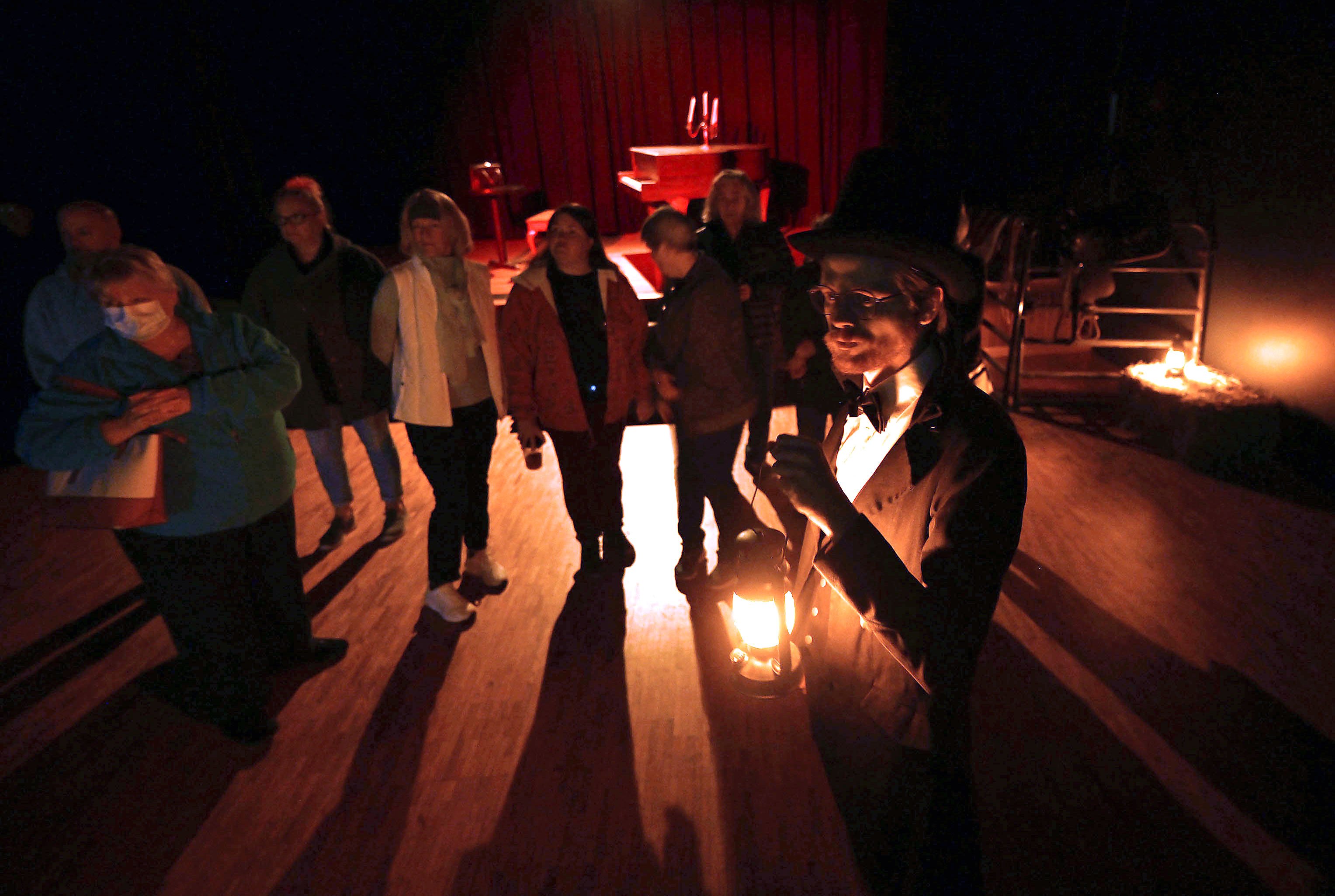 Tour guide Owen Lewis, right, holds a lantern Thursday night as he leads patrons during the Shadows in the Hall performances at the 1864 theater in downtown Gardiner. The eerie vignettes, performed by about 30 Gardiner area actors, dancers and musicians, featured stories from the past and others from the historic building. Performances happened over three floors of the theater. Over 100 patrons were hosted during the event which happens again Friday night. (Rich Abrahamson/Staff Photographer)Water Street traffic passes Johnson Hall Opera House, left, during Thursday night’s Shadows in the Hall performances at the 1864 theater in downtown Gardiner. (Rich Abrahamson/Staff Photographer)Patrons await their turn to tour Johnson Hall Opera House during Thursday night’s Shadows in the Hall performances at the 1864 theater in downtown Gardiner. (Rich Abrahamson/Staff Photographer)Actors Maureen Kendzierski, left, and Lisa Copenhaver perform Thursday during the Shadows in the Hall performances at the 1864 Johnson Hall Opera House in downtown Gardiner. (Rich Abrahamson/Staff Photographer)Jason Goucher adjusts lights and sound Thursday during the Shadows in the Hall performances at the 1864 Johnson Hall Opera House in downtown Gardiner. (Rich Abrahamson/Staff Photographer)Members of the Gardiner Area High School Guitar Club perform “Don’t Fear the Reaper” by Blue Oyster Cult, during the Shadows in the Hall performances Thursday night at the 1864 Johnson Hall Opera House in downtown Gardiner. (Rich Abrahamson/Staff Photographer)Actor Katie Coan performs during the Shadows in the Hall performances Thursday night at the 1864 Johnson Hall Opera House in downtown Gardiner. (Rich Abrahamson/Staff Photographer)Actors Cody Alexander, center, and Dylan Anderson, at cash register, perform a holdup scene Thursday during the Shadows in the Hall performances at the1864 Johnson Hall Opera House in downtown Gardiner. (Rich Abrahamson/Staff Photographer)