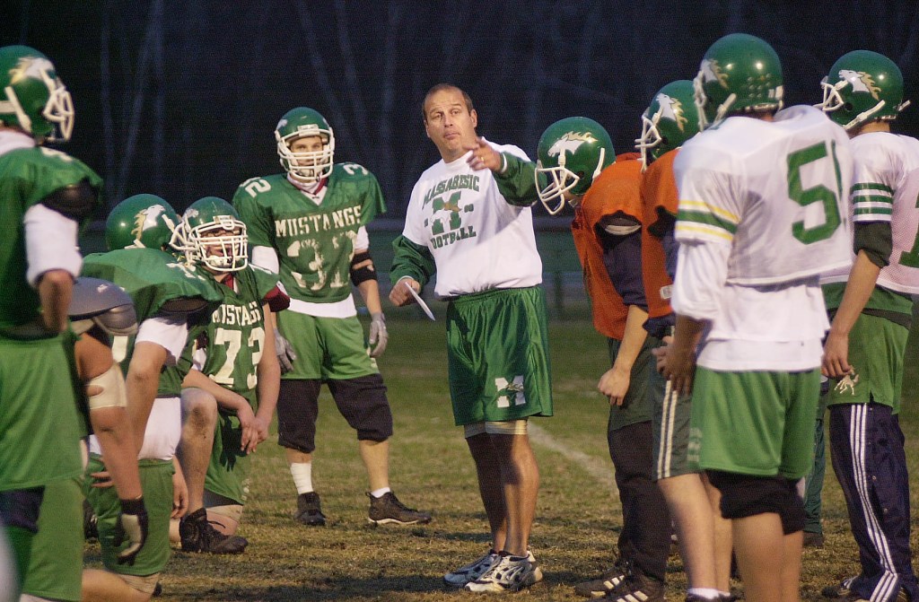 Massabesic football coach John Morin goes over plays with his team during a practice in advance of the 2000 Western Maine Class A championship game against South Portland. (Press Herald file photo)
