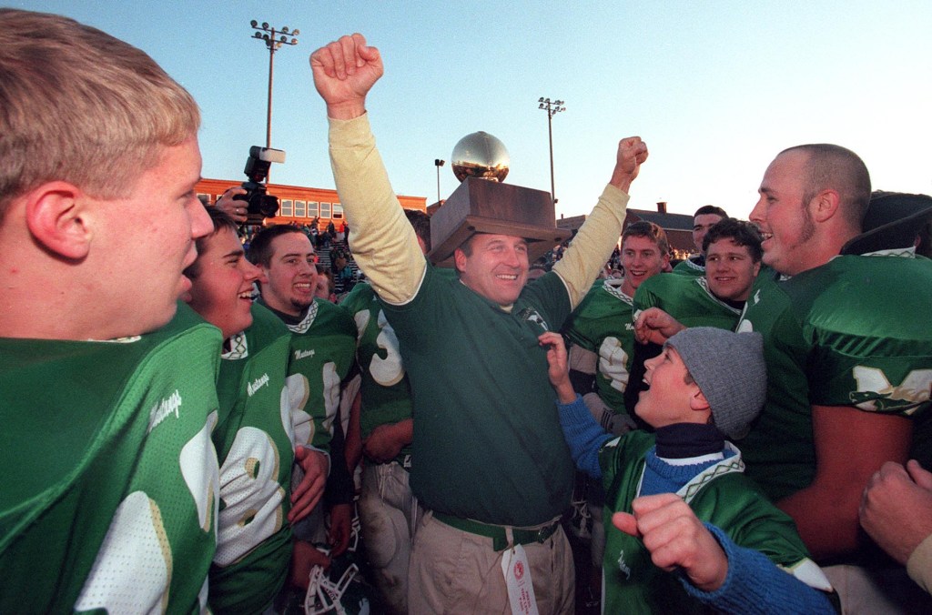 Massabesic football coach John Morin celebrates with his team after the Mustangs defeated Bangor to win the 2000 Class A Championship in Portland. The group celebrated the 25th anniversary of that title last weekend. (Press Herald file photo)