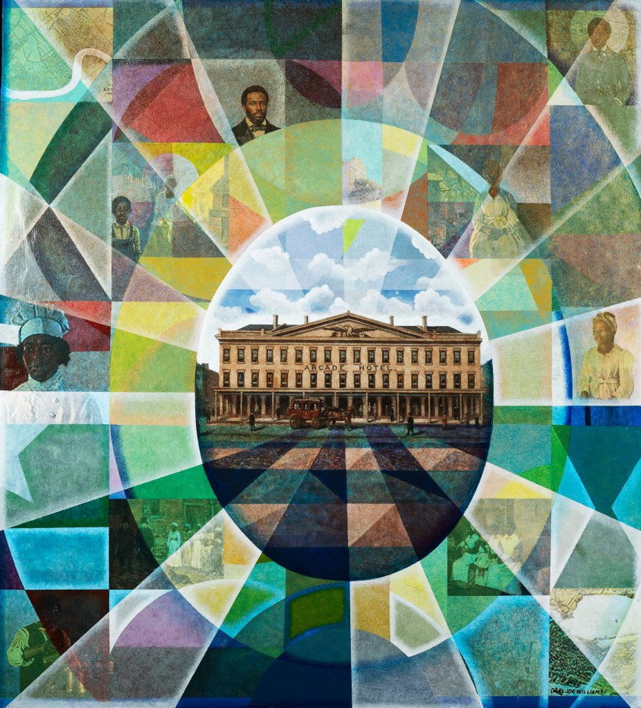 Williams studied the research gathered by mansion staff, and where they left gaps or fell short, he relied on his imagination. The painting radiates color, rather than the sepia tones of historic records. At the center is the Arcade Hotel, where Morse relied on enslaved labor. The scene is surrounded by the faces of people who might have been forced to work there