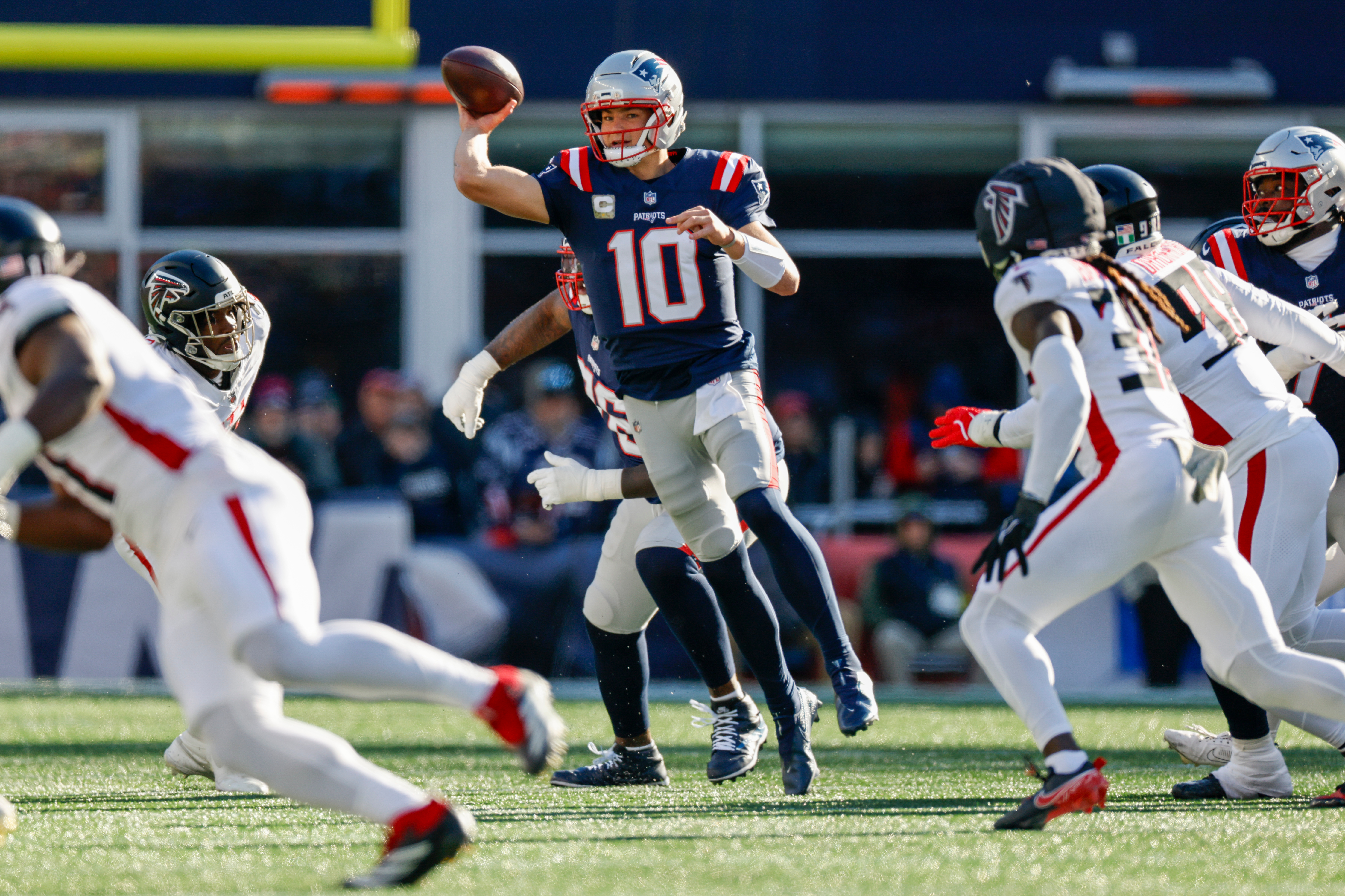 Patriots quarterback Drake Maye had two fumbles and an interception in New England’s win over Atlanta on Sunday, but overall has played well. He is completing 74.1% of his passes this season for 2,285 yards and 17 touchdowns. (Greg M. Cooper/Associated Press)