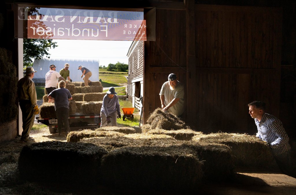 Sister April Baxter, in sun hat at center, reaches for a bale of hay while helping to load a trailer outside the barn at the Sabbathday Lake Shaker Village. At right is Michael Graham, director of the Shaker village. (Gregory Rec/Staff Photographer)