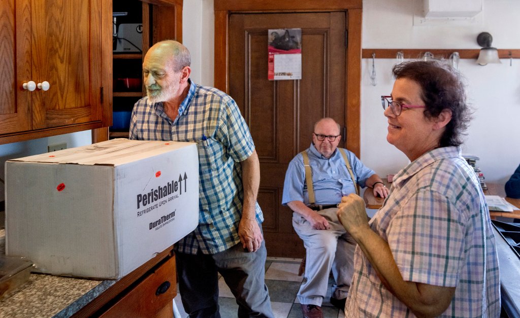 Sister April Baxter, right, laughs while Brother Arnold Hadd tries to figure out the origin of a box of cheese that was delivered to the Sabbathday Lake Shaker Village in New Gloucester on Sept. 10. (Gregory Rec/Staff Photographer)