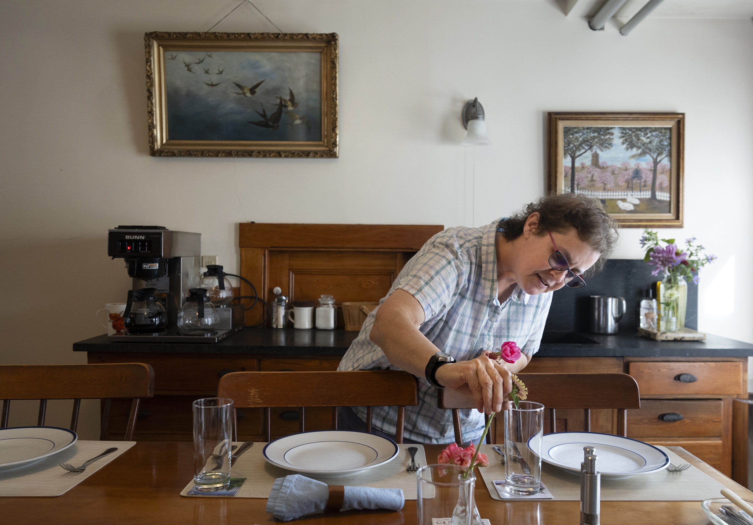 Sister April Baxter places a zinnia in a vase on a dining room table in the dwelling house. (Gregory Rec/Staff Photographer)