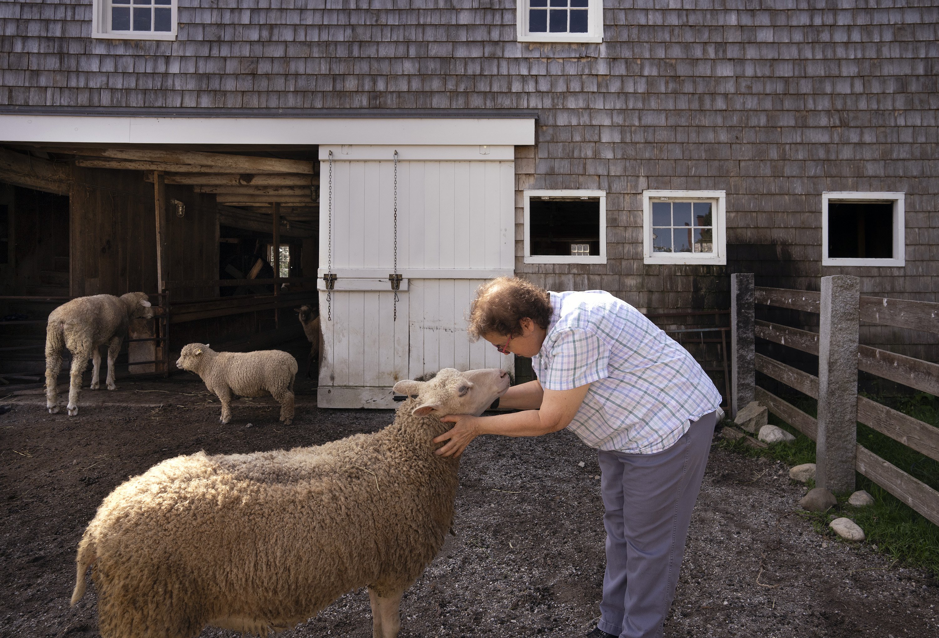 Sister April Baxter visits with a sheep in a pen outside the barn at the Sabbthday Lake Shaker Village in New Gloucester. (Gregory Rec/Staff Photographer)