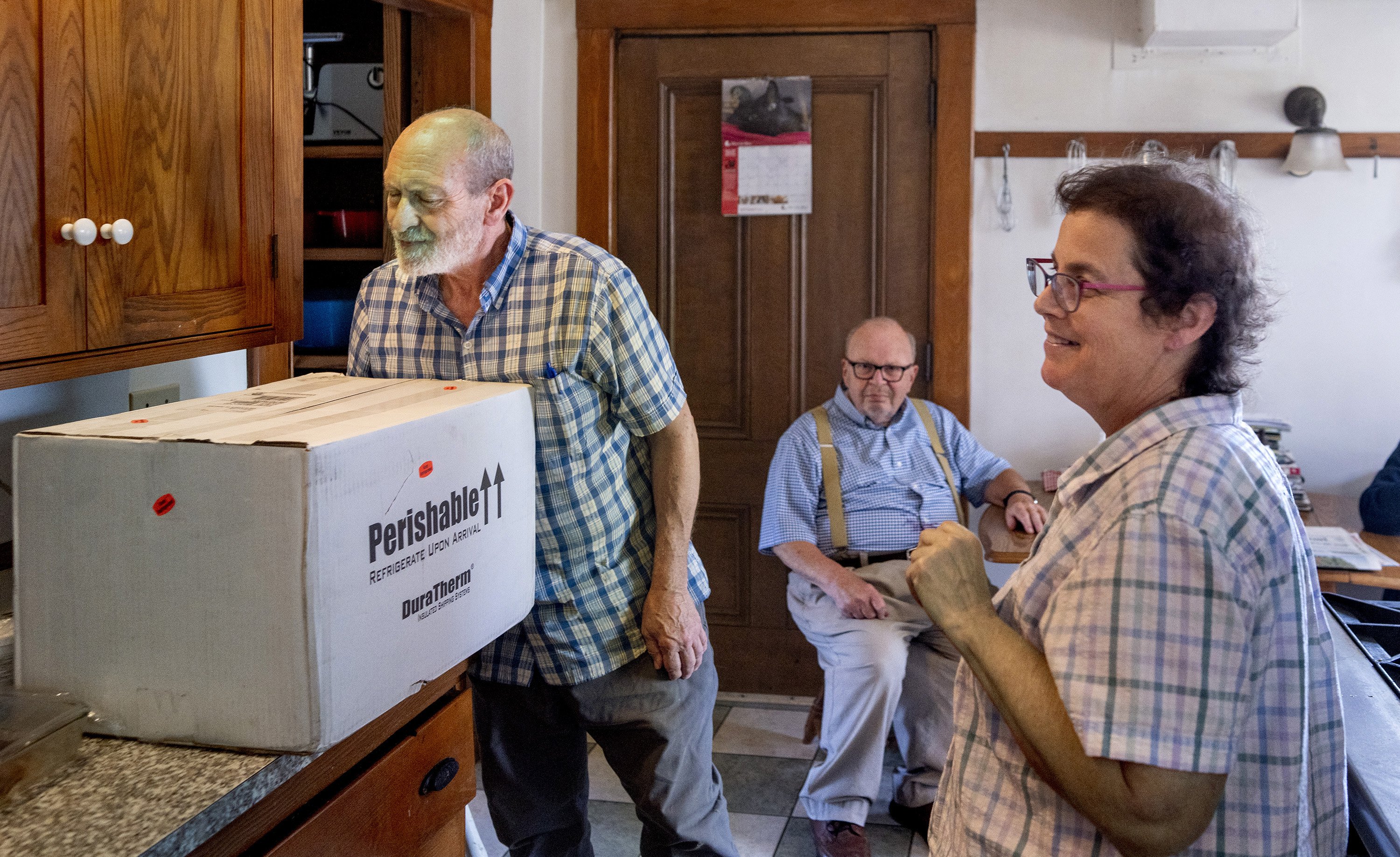 Sister April Baxter, right, laughs while Brother Arnold Hadd tries to figure out the origin of a box of cheese that was delivered to the Sabbathday Lake Shaker Village in New Gloucester on Sept. 10. (Gregory Rec/Staff Photographer)