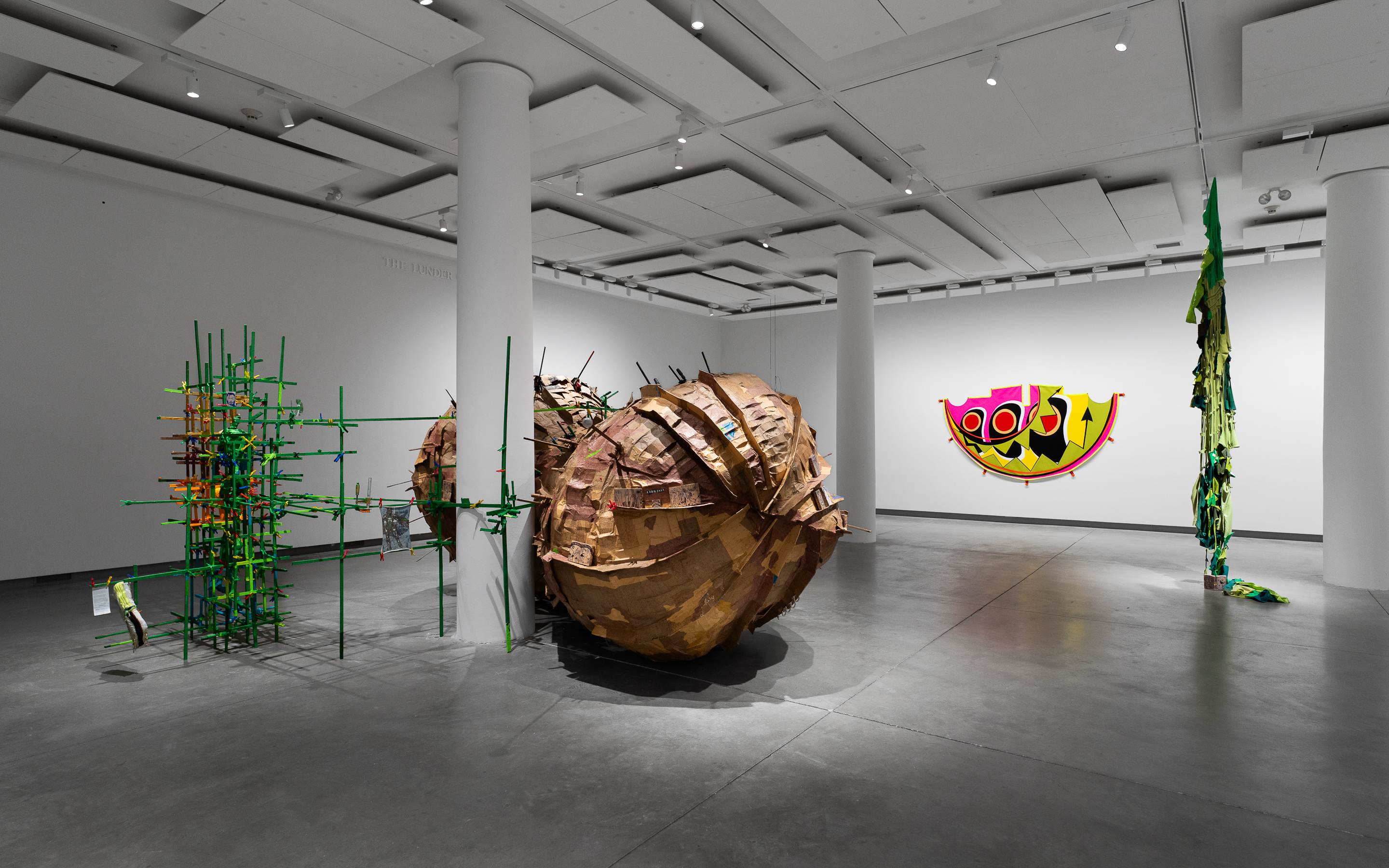 The Senegalese-American artist Pap Souleye Fall’s “NIT, NITAAY GARABAM (arc 2)” is an enormous peanut-shaped sculpture that dominates the center of the rear-most gallery. The piece carries more associations than I can go into here: the peanut industry in West Africa, memories of recently deceased childhood artist friend Baxter Koziol, and a character named Dead Pixel, to name a few. The information plaque will provide more context, but what comes across is the intricate complexity and wild imagination of Fall’s mind.