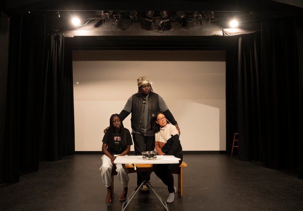 Jovia Ochia, left, Machar, center, and Michelle Tham rehearse a scene from Gospel Messiah: A Refugee Oratorio at The Hill Arts in Portland on Nov. 1. (Gregory Rec/Staff Photographer)