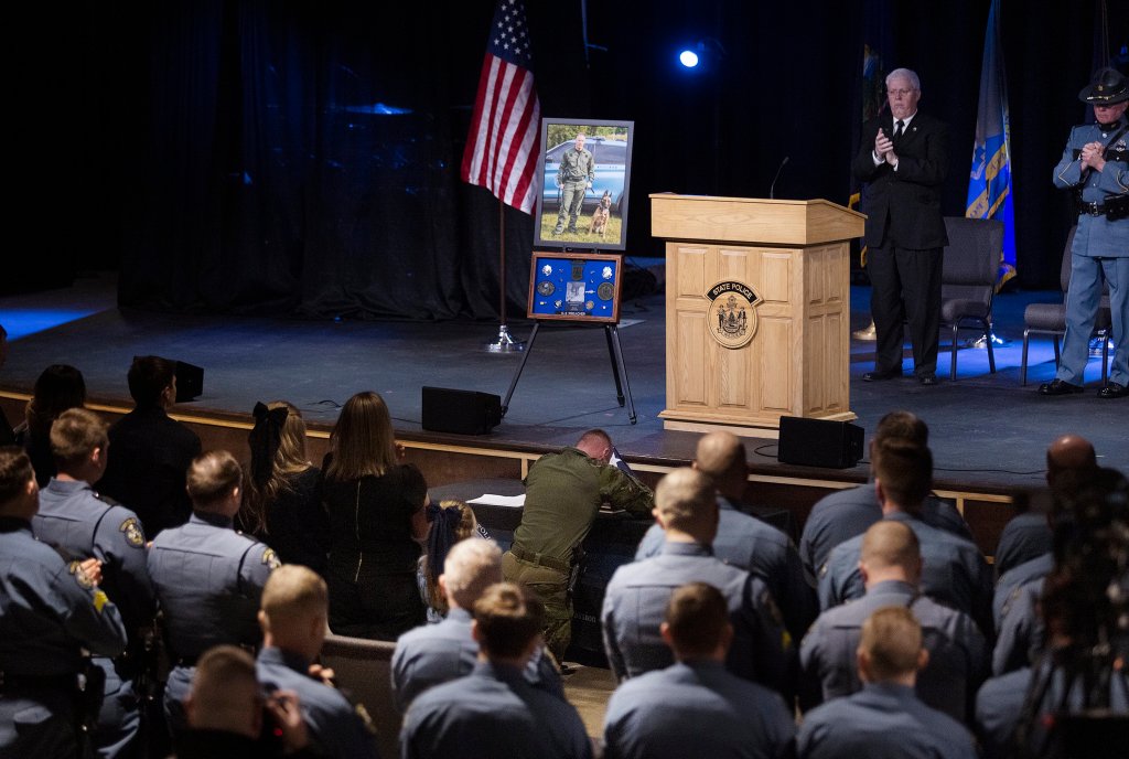Preacher, the police dog, was taken to an emergency veterinarian for surgery but died of his injuries. State police held a funeral in his honor in South Portland on Feb. 12.