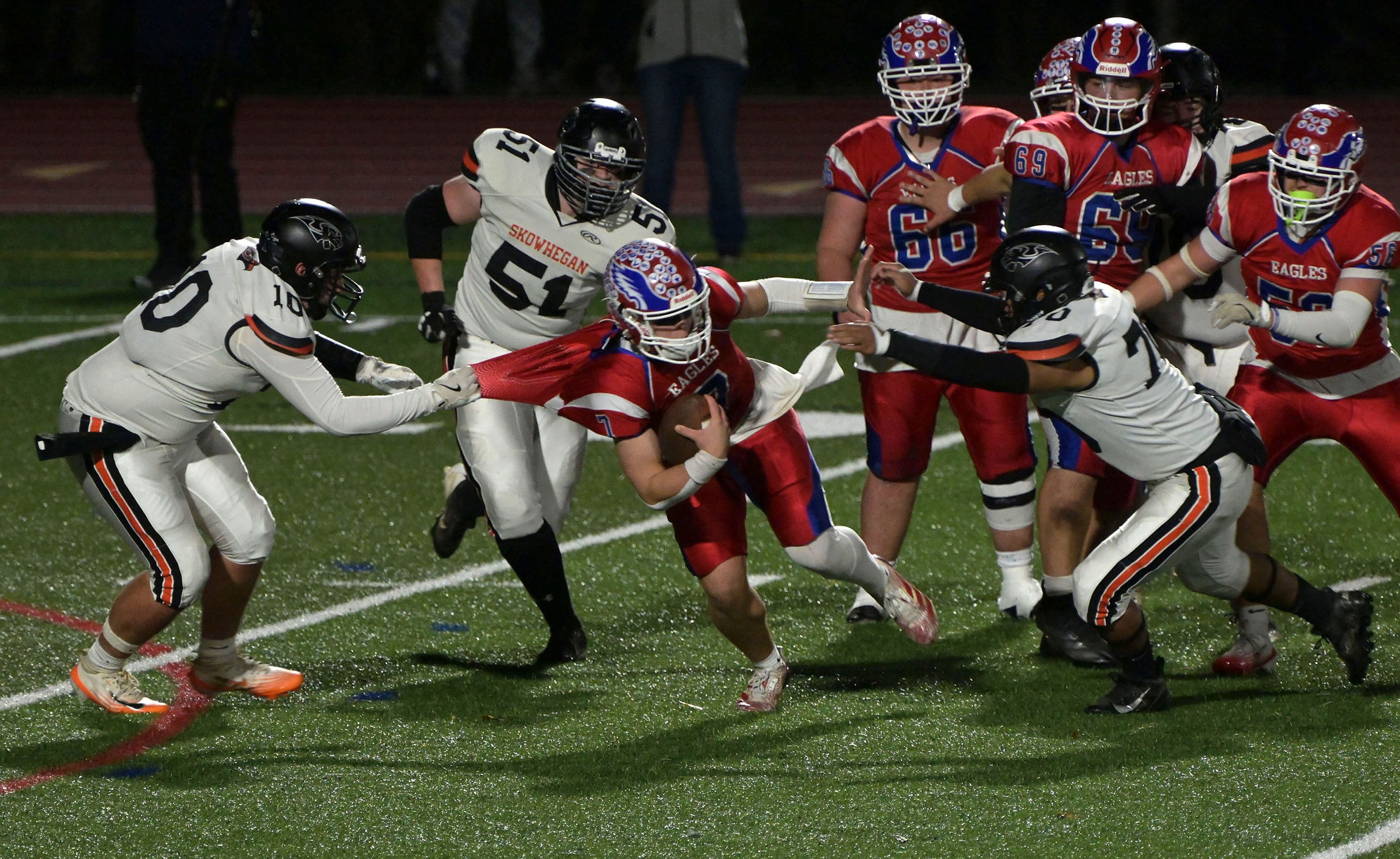 Messakonskee quarterback Tatum Douchette is taken down by Skowhegan tacklers, from left, Jason Aubin, Bill Linkletter and Sebastian Stewart, during an Oct. 31 game at Messalonskee High School in Oakland. (Rich Abrahamson/Staff Photographer)
