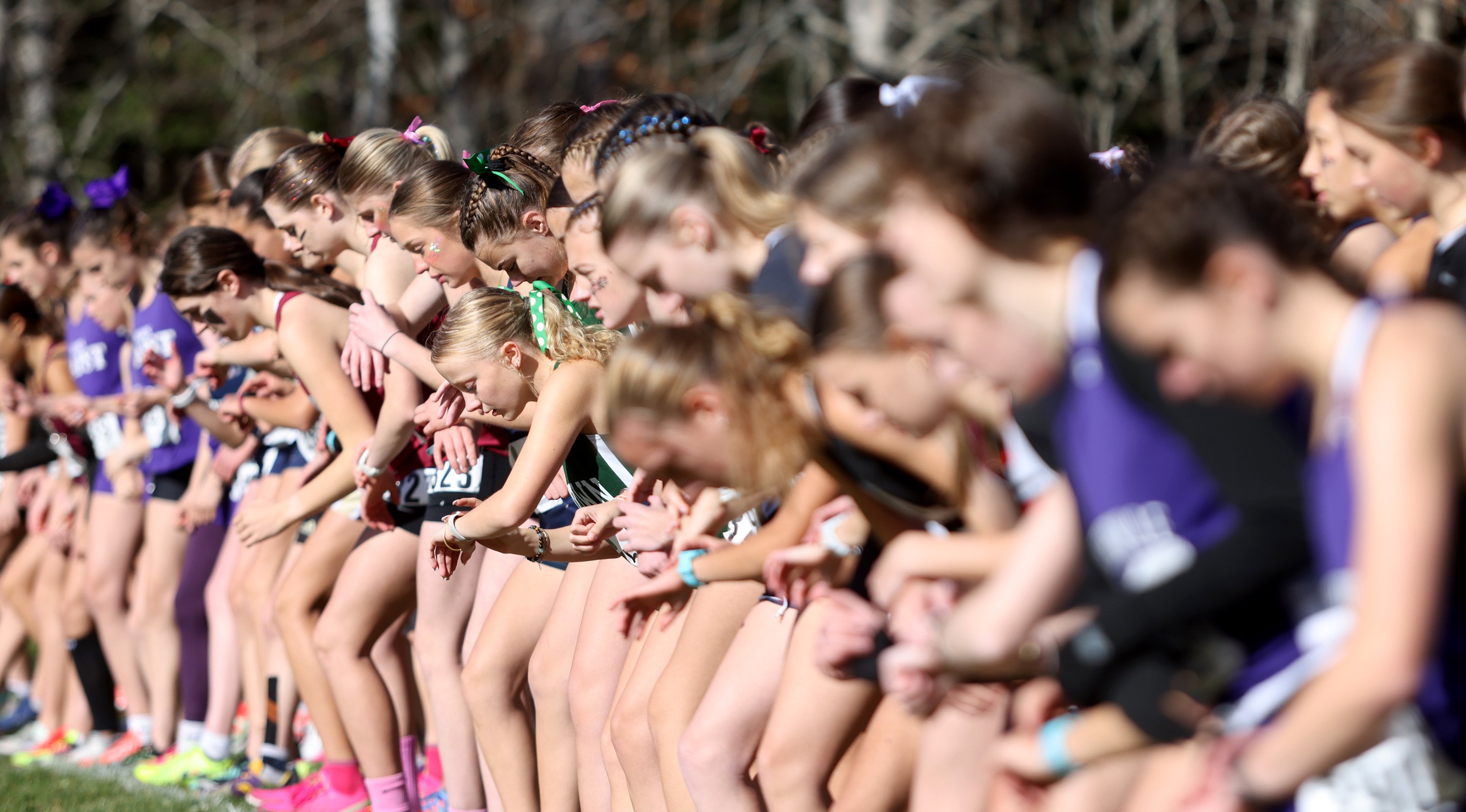 The Class B girls start their watches before the cross country state championship Saturday in Augusta. (Anna Chadwick/Staff Photographer)