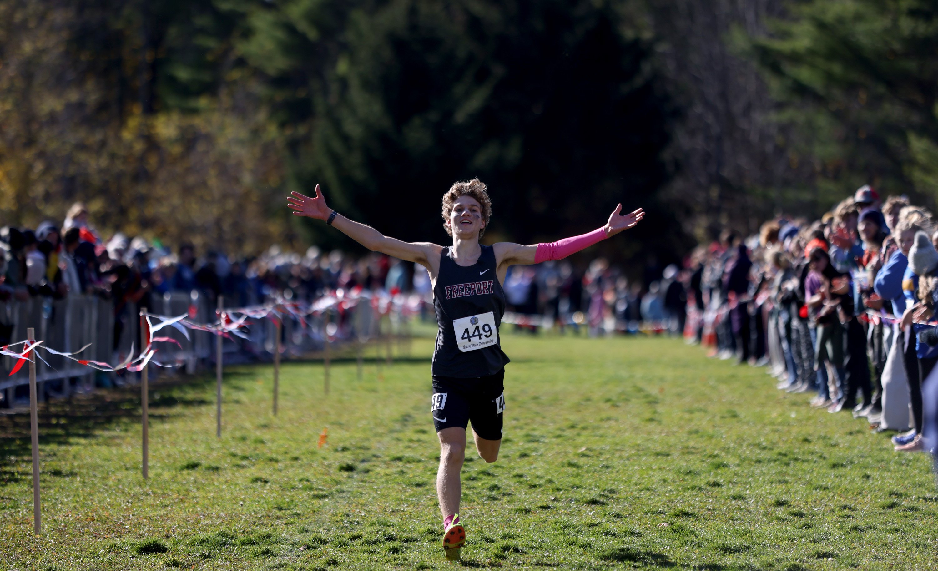 Freeport’s Alex Gilbert celebrates as he wins the boys Class B cross country state championship race Saturday in Augusta with a time of 16:35.14. (Anna Chadwick/Staff Photographer)