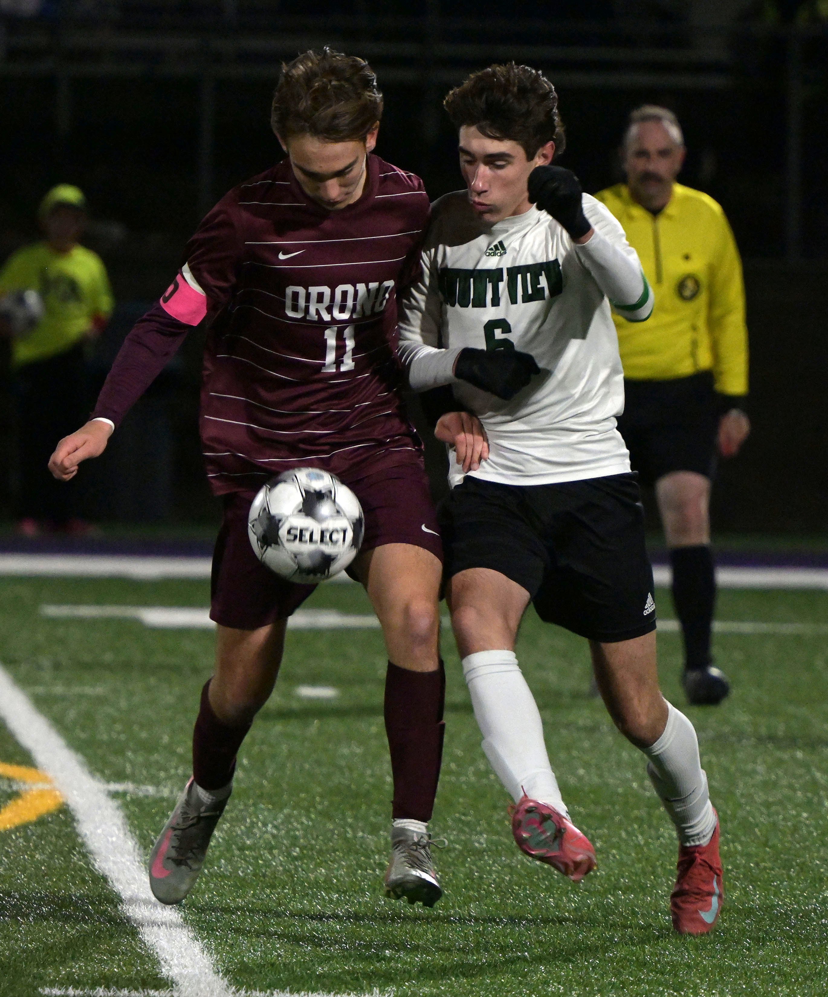 Mount View’s Stuart Knowlton, right, and Orono’s Wesley Crouse battle for the ball Tuesday in Hampden. (Rich Abrahamson/Staff Photographer)
