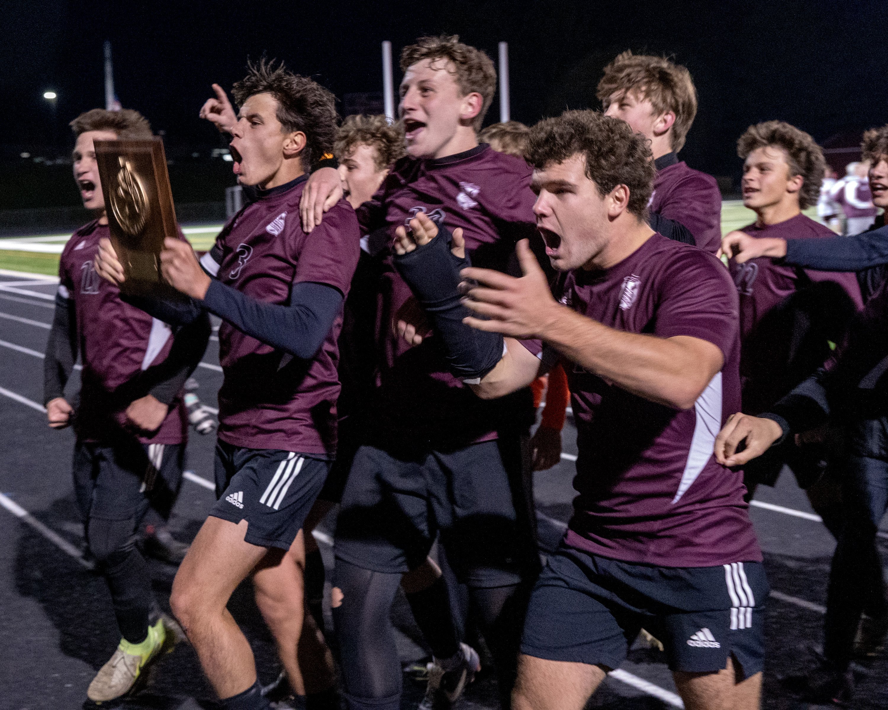The Monmouth Academy boys soccer team carries the championship plaque over to celebrate with fans after they beat Richmond 5-1 in the Class D South final Nov. 4 in Augusta. (Joe Phelan/Staff photographer)