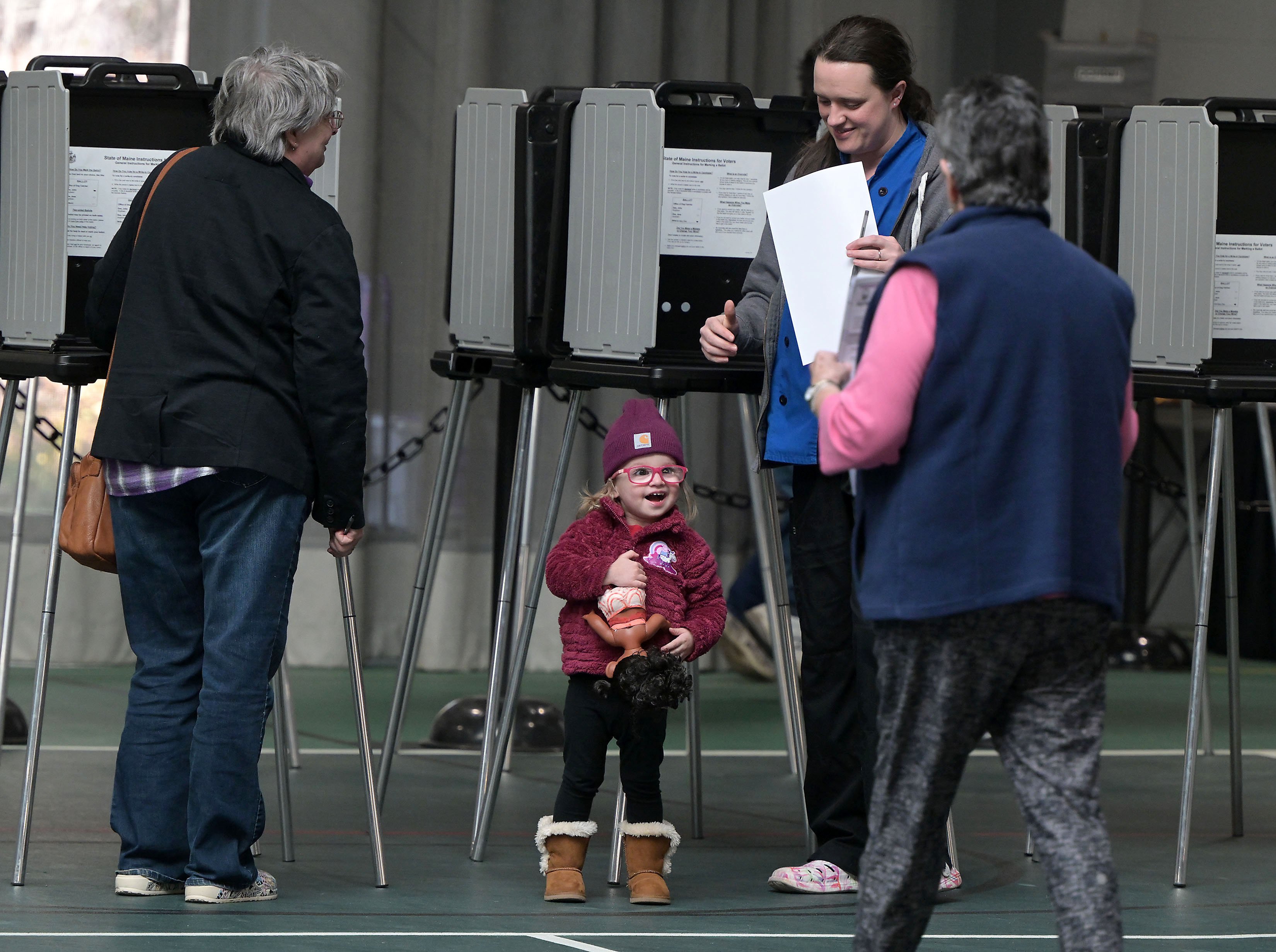 Aurora Chambers, 2, of Waterville, joins her grandmother Linda Witham, left, and mom Ashley Chambers as they cast their ballots Tuesday at Thomas College in Waterville. Witham said this was the third time the trio had been to vote together. (Rich Abrahamson/Staff Photographer)