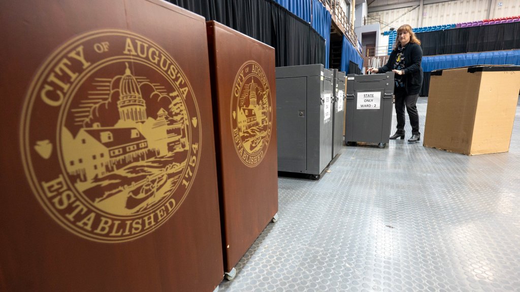 Augusta City Clerk Kelly Gooldrup sets up ballot machines Monday at the Augusta Civic Center in Augusta. Workers were preparing for the Tuesday elections where all the city’s wards will vote in the same location instead of four separate ward sites. (Joe Phelan/Staff Photographer)