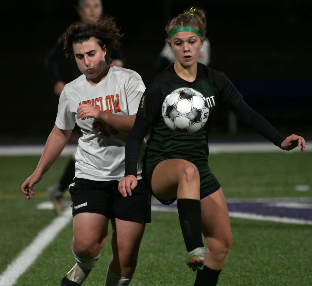 Fort Kent’s Kamryn Martin, right, and Winslow’s Ilona Coulin compete for the ball Tuesday at Hampden Academy in Hampden. (Rich Abrahamson/Staff Photographer)