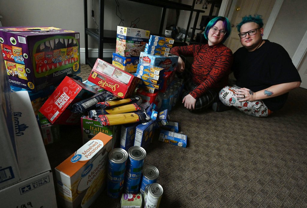 Liz, left, and Eryn Merriam sit Oct. 30 with stockpiles of food they plan to share with community members. The couple also made and packaged American chop suey in their Waterville home. (Rich Abrahamson/Staff Photographer)