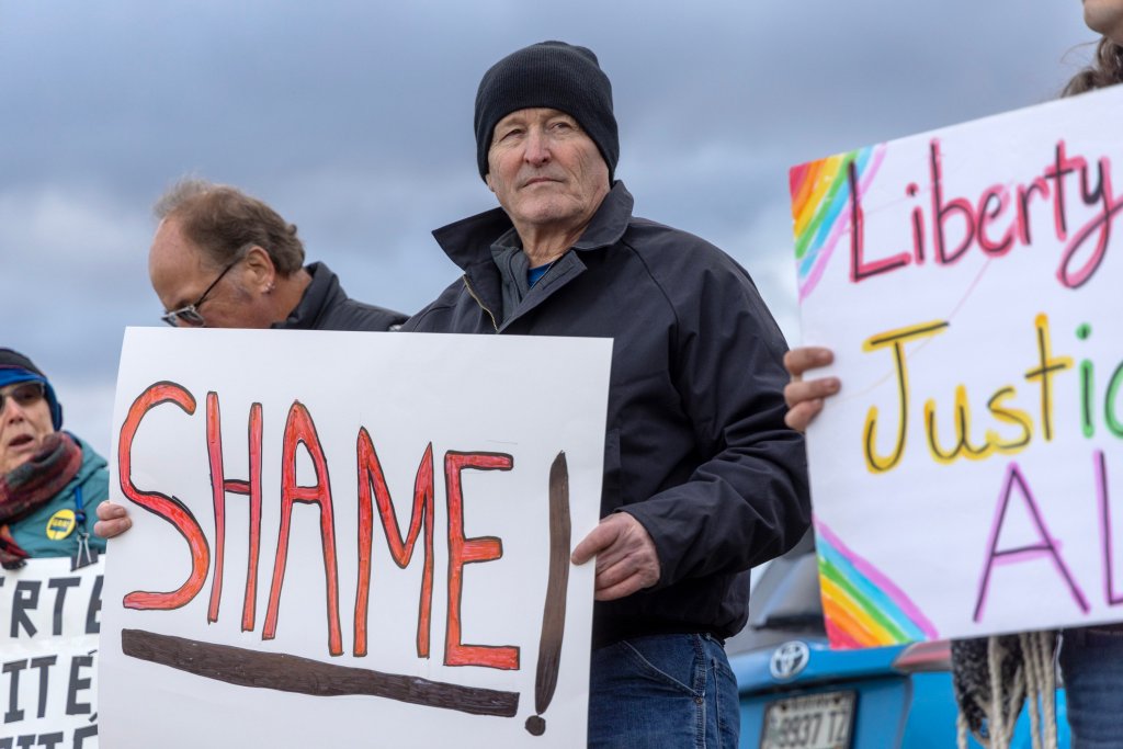 Blanketed in knitted hats and gloves, members of the group waved signs at passing vehicles on Kennedy Memorial Drive. One sign read: “Angus King capitulated. Damn coward.” Another just said, “shame.”