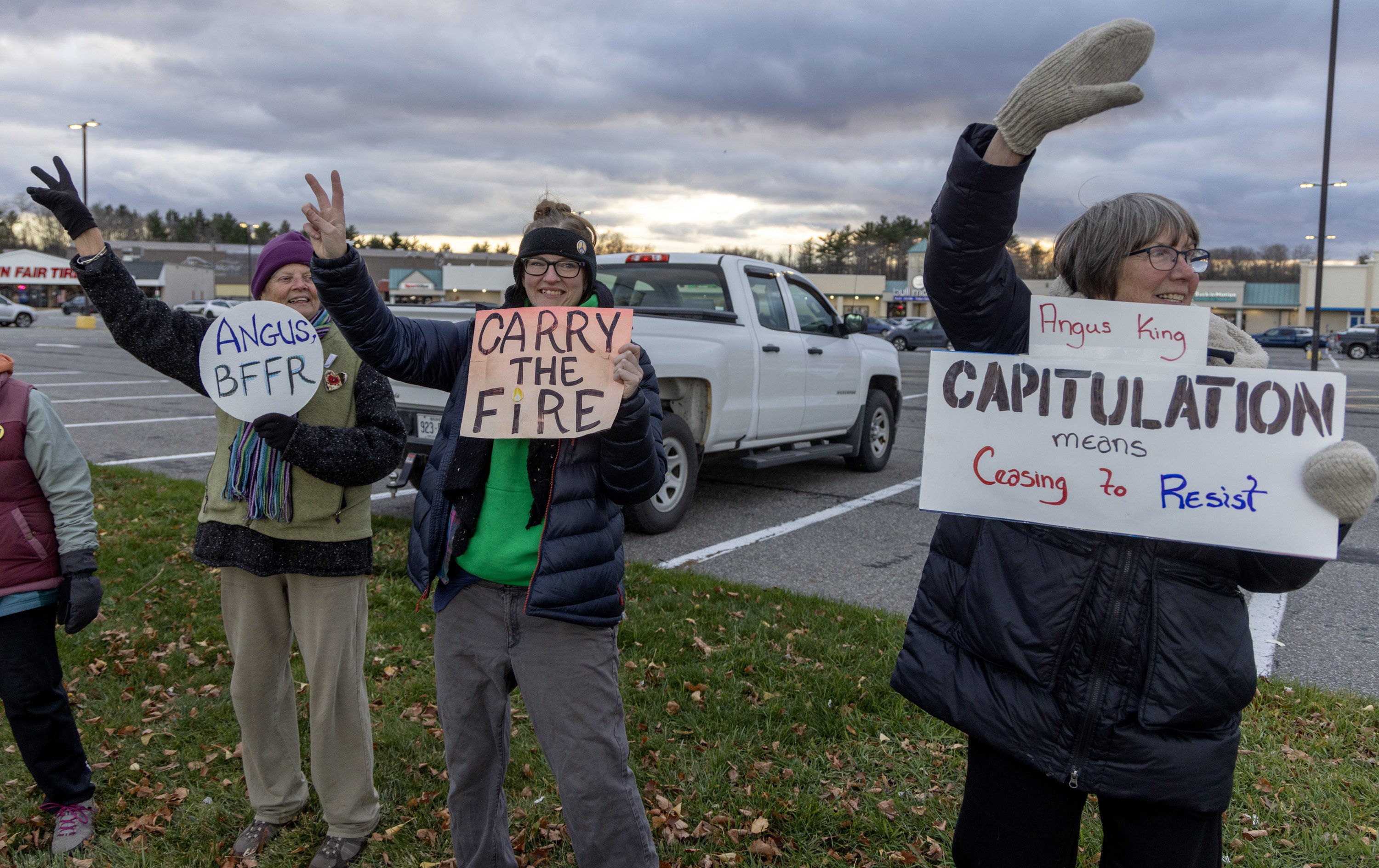 Blanketed in knitted hats and gloves, members of the group waved signs at passing vehicles on Kennedy Memorial Drive. One sign read: “Angus King capitulated. Damn coward.” Another just said, “shame.”