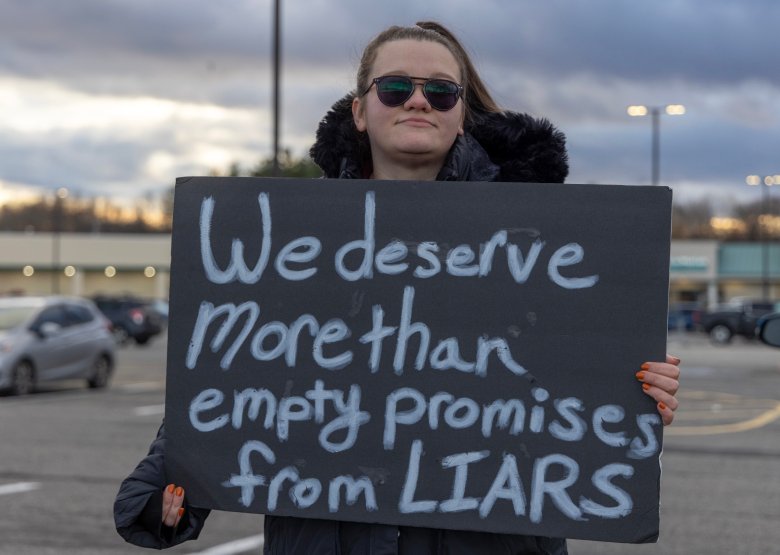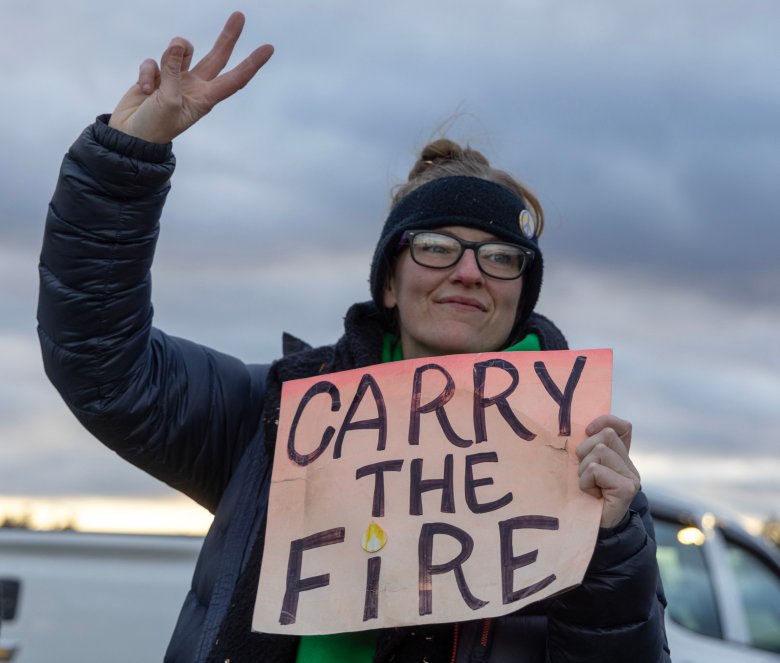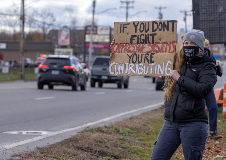 Dana Bateman, a 51-year-old artist and retail worker, joined friends and neighbors in Brunswick on Tuesday at a last-minute protest against King’s decision. She was heartened that more than two dozen people showed up and stood in the cold rain and snow to express their frustrations.