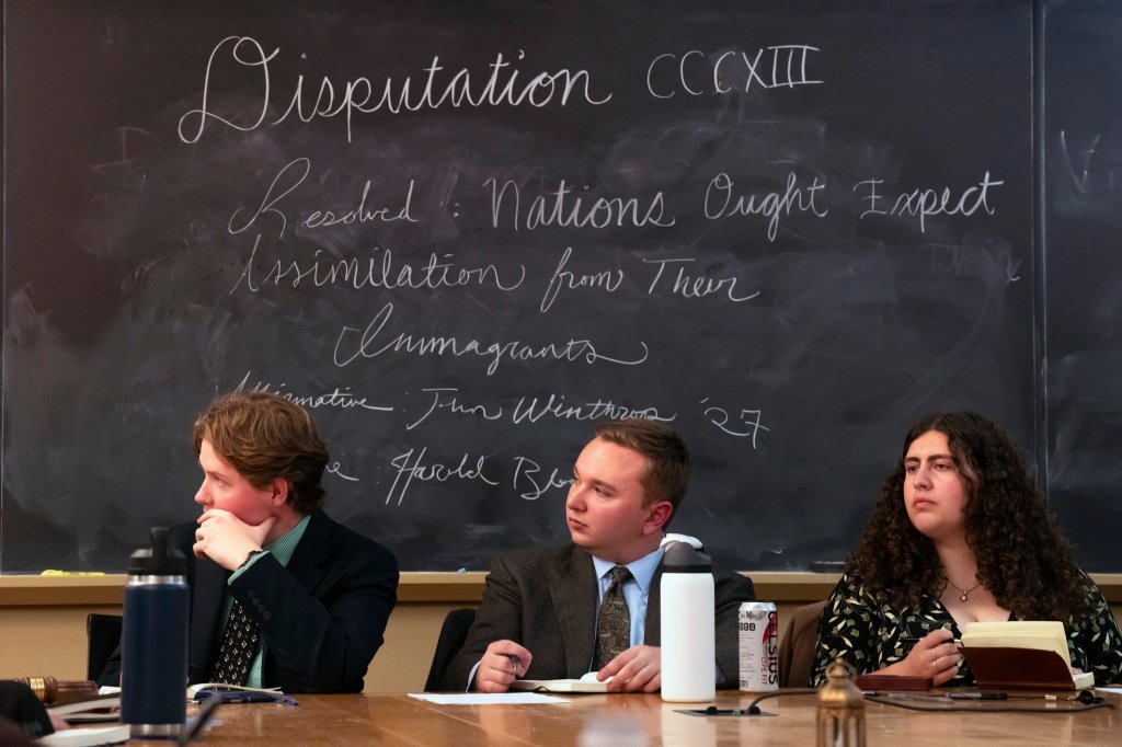 Seniors Maxwell Payne, Mark Mateo and Sofia Fogg listen to Zak Asplin make his case for the statement on the board behind them ‘Nations ought expect assimilation from their immigrants’ during a disputation of the Peucinian Society at Bowdoin College on October 16. (Gregory Rec/Staff Photographer)