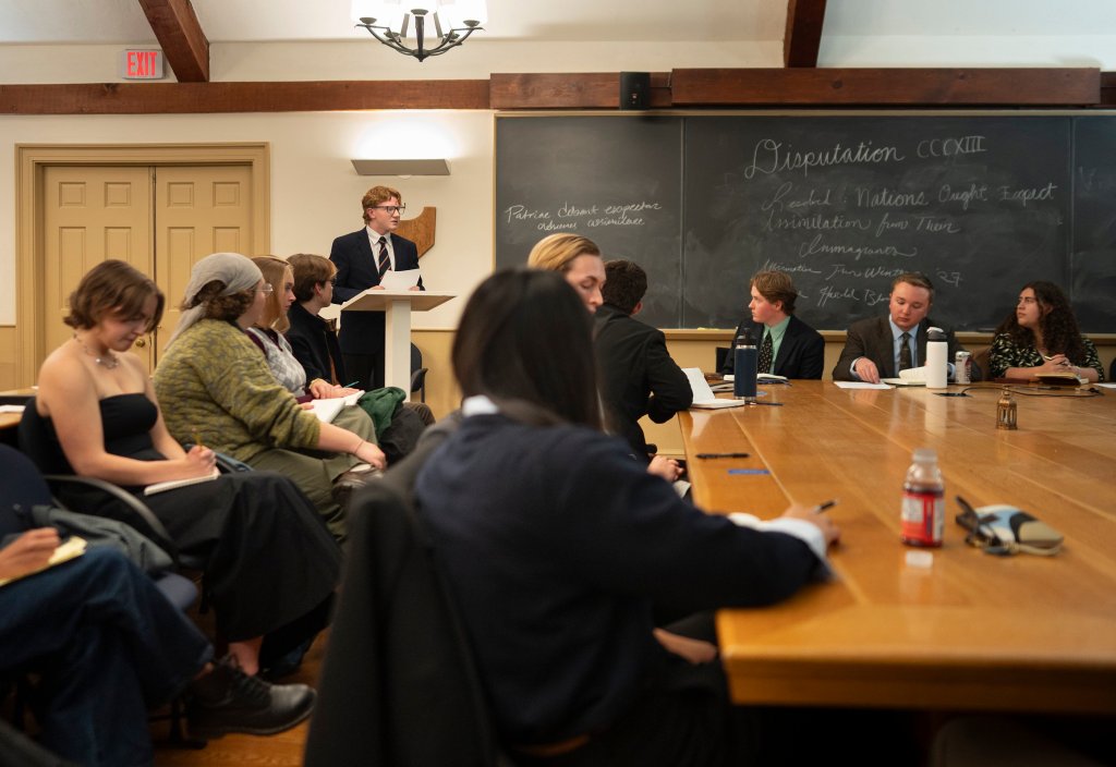 Junior Zak Asplin, at podium, makes the argument for the statement ‘Nations ought expect assimilation from their immigrants’ during a disputation of the Peucinian Society at Bowdoin College on October 16. (Gregory Rec/Staff Photographer)
