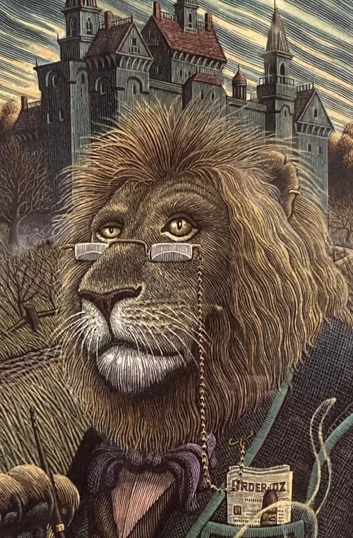 Some of Smith’s “Wicked” works have been displayed in exhibits around Maine. One of his illustrations for another book in the “Wicked” series, “A Lion Among Men,” is on view now through Jan. 31 at the Falmouth Memorial Library, as part of an exhibition called “The Great State of Illustration in Maine.” It shows a dignified and serious lion, wearing glasses, a suit and bowtie, with an ominous castle behind him.