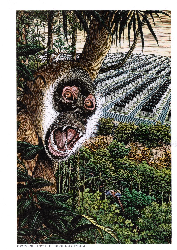 Smith starts by drawing the image. Using carbon paper, he traces every line of that image on top of the specially-made scratch board paper, which includes a layer of black color on top of a white layer. Once the image is transferred to the scratchboard, he uses a scraping tool to scrape away parts of the black and reveal parts of the white, to create the image. He ads color to the illustration with watercolor paint.