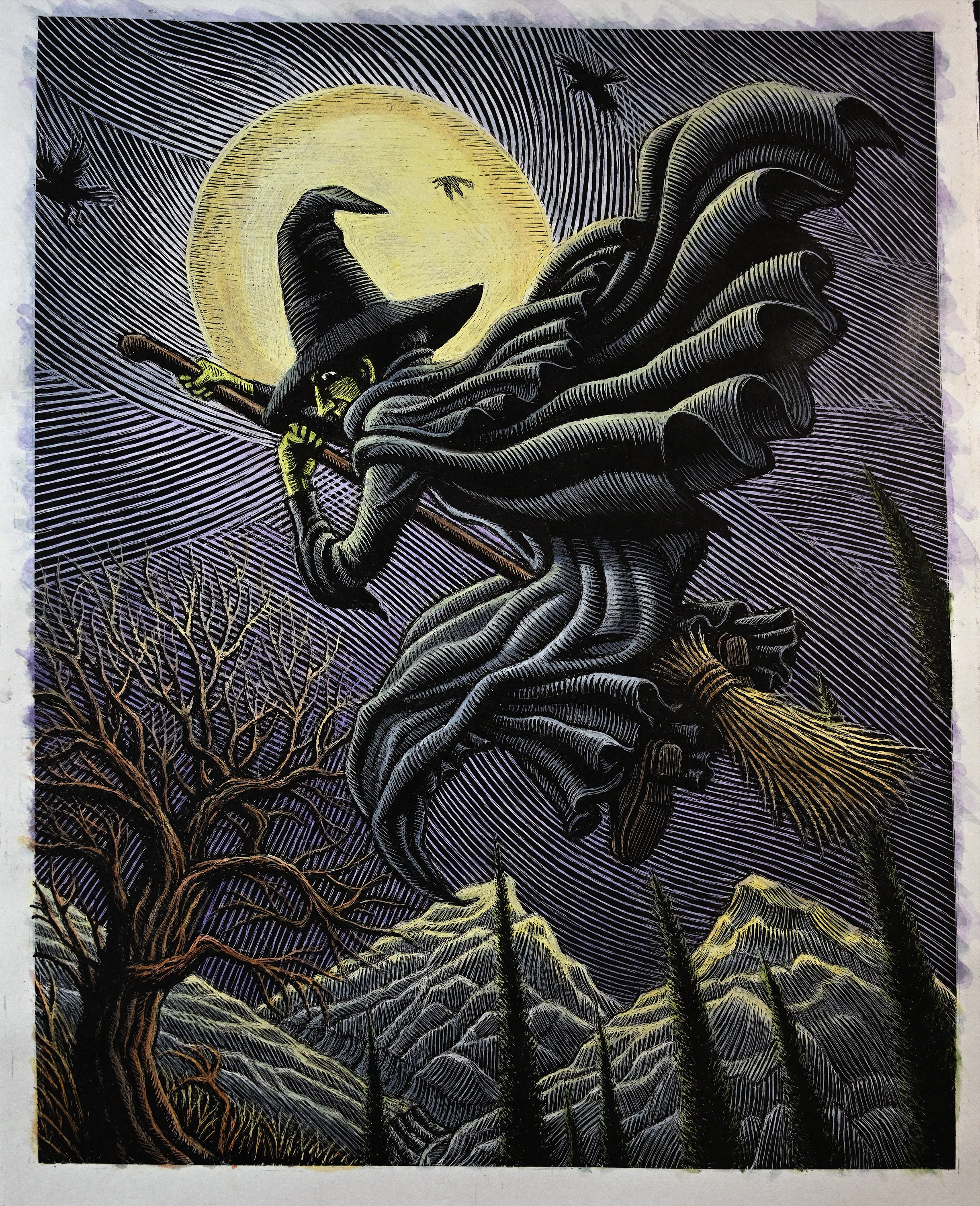 Smith starts by drawing the image. Using carbon paper, he traces every line of that image on top of the specially-made scratch board paper, which includes a layer of black color on top of a white layer. Once the image is transferred to the scratchboard, he uses a scraping tool to scrape away parts of the black and reveal parts of the white, to create the image. He ads color to the illustration with watercolor paint.