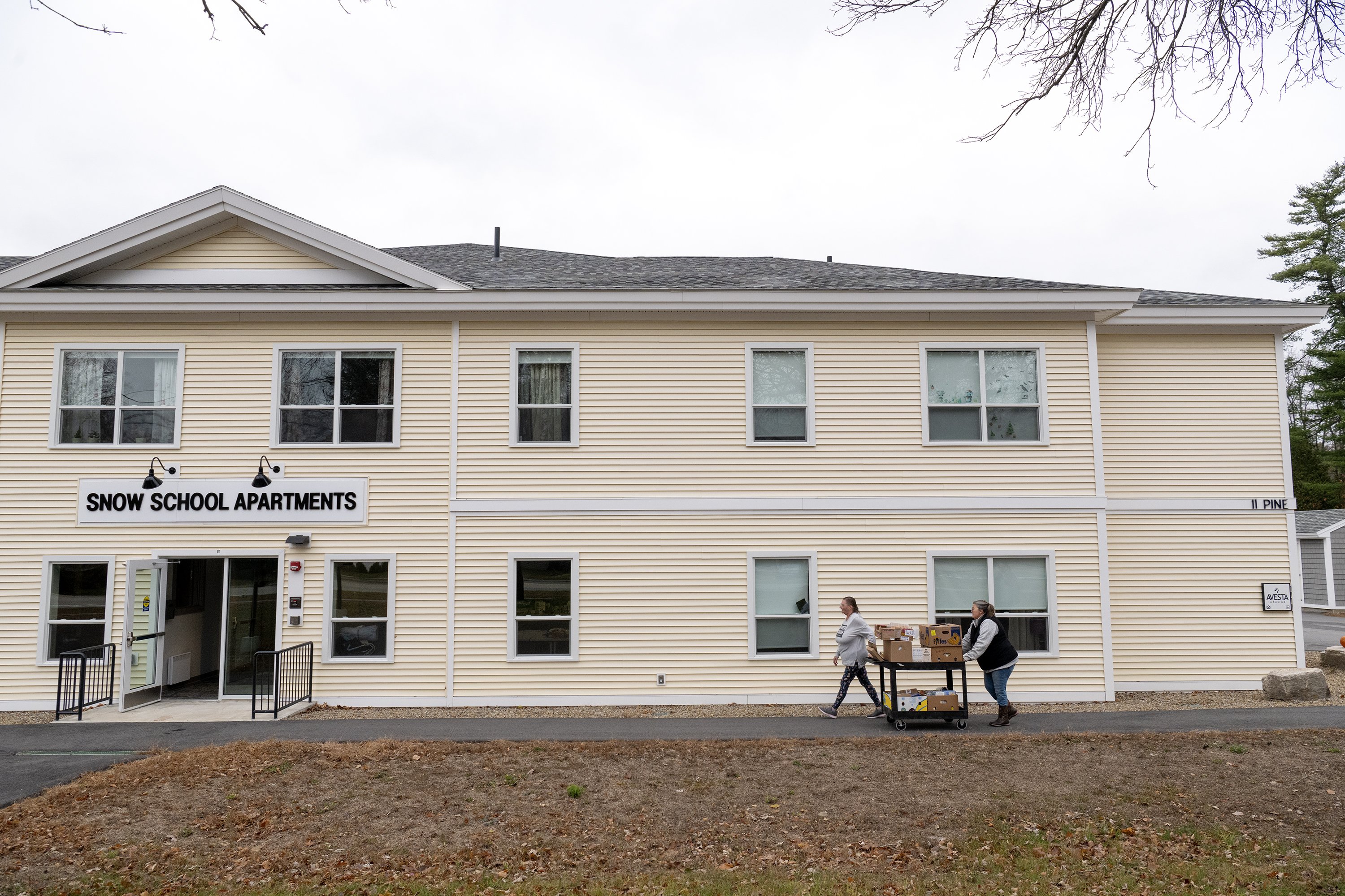 Arey’s next stop was the Snow School Apartments in Fryeburg, home to about 30 people. Most of them need some help with food, but the individual household boxes were too much for some. So resident Ethelyn Walker reached out to Swett and arranged for deliveries that would help her stock a small food pantry in the building’s community room.