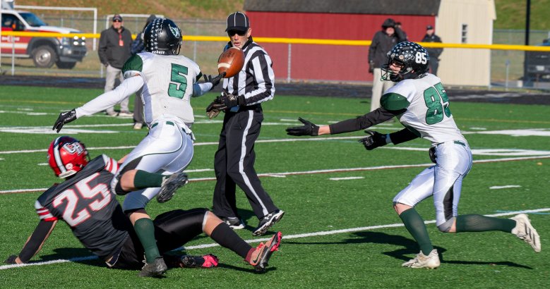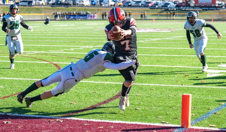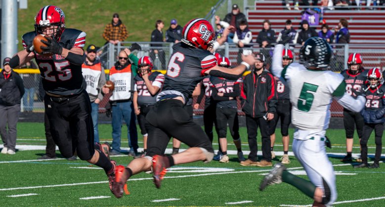 Ethan Dingle’s 12-yard TD run early in the third quarter extended the lead, but Spruce Mountain junior Owen Kelvey (113 scrimmage yards) took the following kickoff 81 yards for a touchdown that made it 38-20.