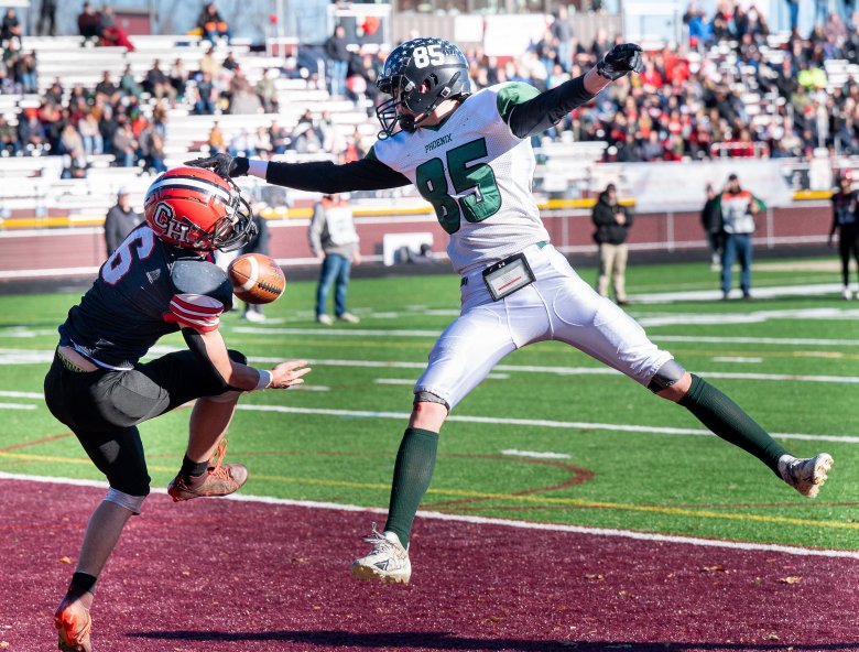 Both Camden Hills and Spruce Mountain (8-2) fumbled early and turned the ball over on downs, but only the top-seeded Phoenix could turn the takeaway into points. Austin Armandi (75 total yards) ran in from the 3 midway through the second quarter to cut the Windjammers’ lead to 8-6.