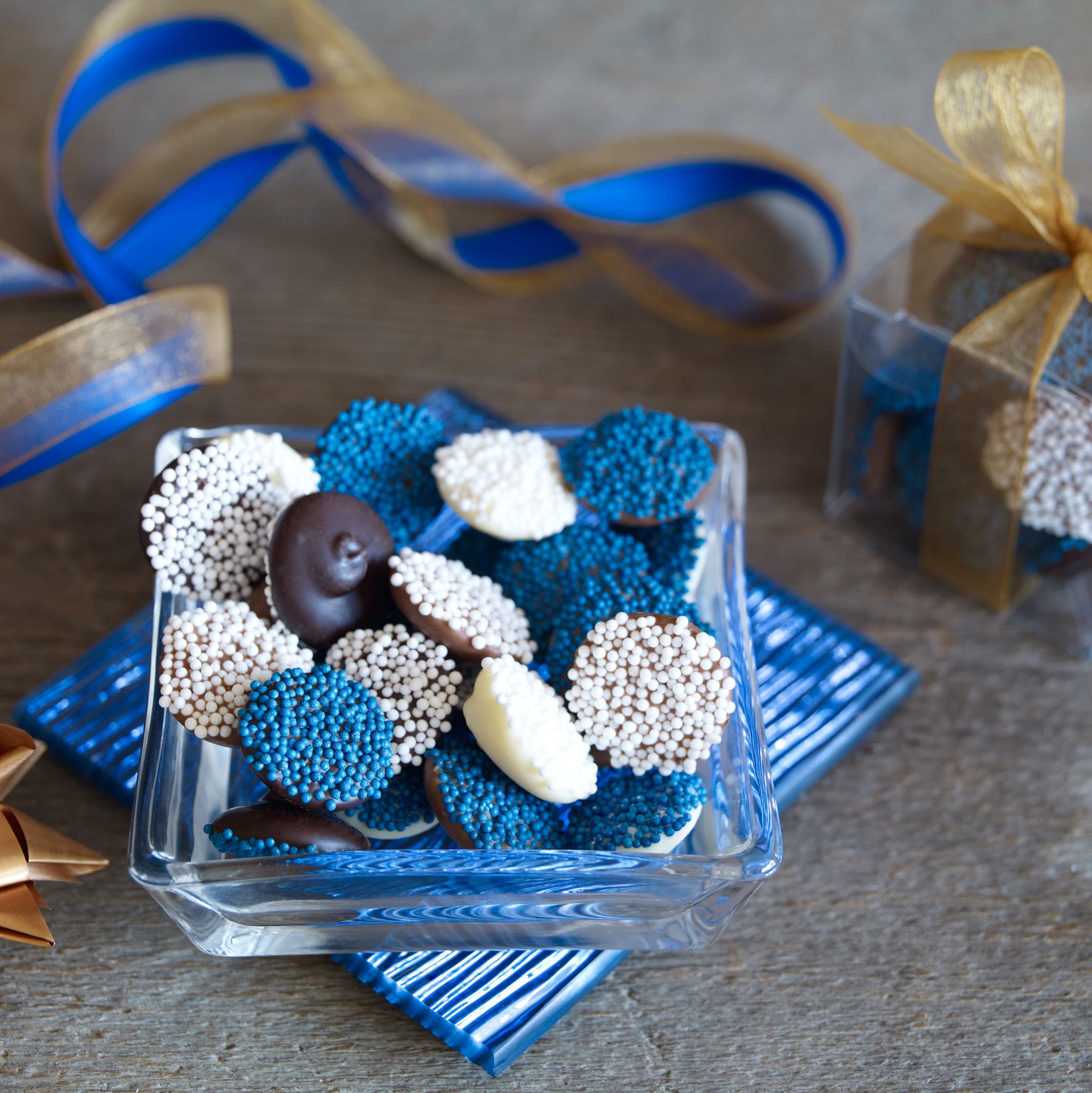 The chocolatiers at Dean’s Sweets hand-pipe Callebaut chocolate onto a bed of crunchy blue and white non pareils to make these festive little bites, which are all nut and gluten-free. Most of the drops are either milk chocolate or 70% dark chocolate, with a few white chocolates mixed in for good measure. The drops come in a gift box tied with a gold bow, making it “kind of the perfect little gift” for Hanukkah, said Dean’s Sweets co-owner Kristin Thalheimer Bingham.
