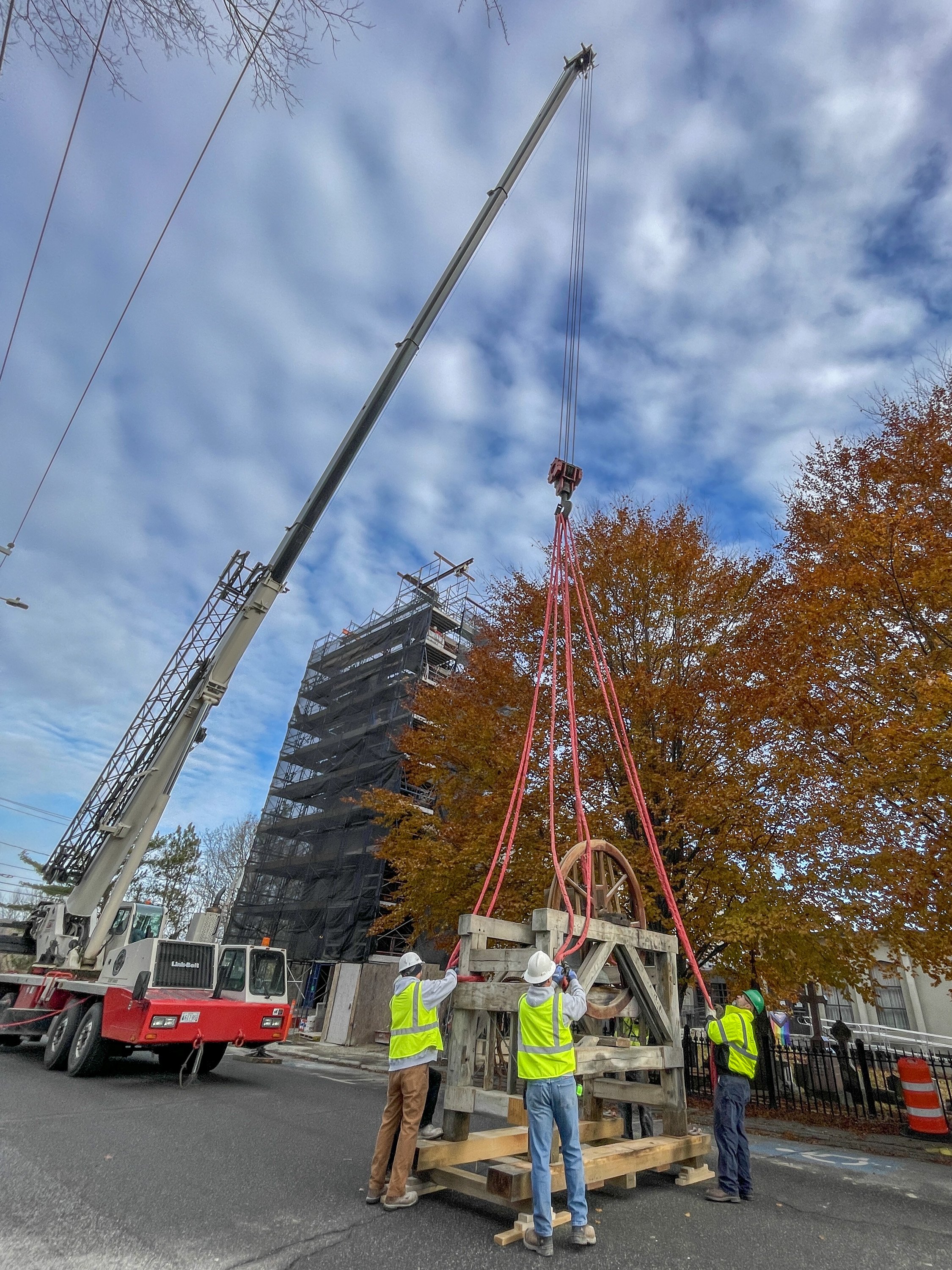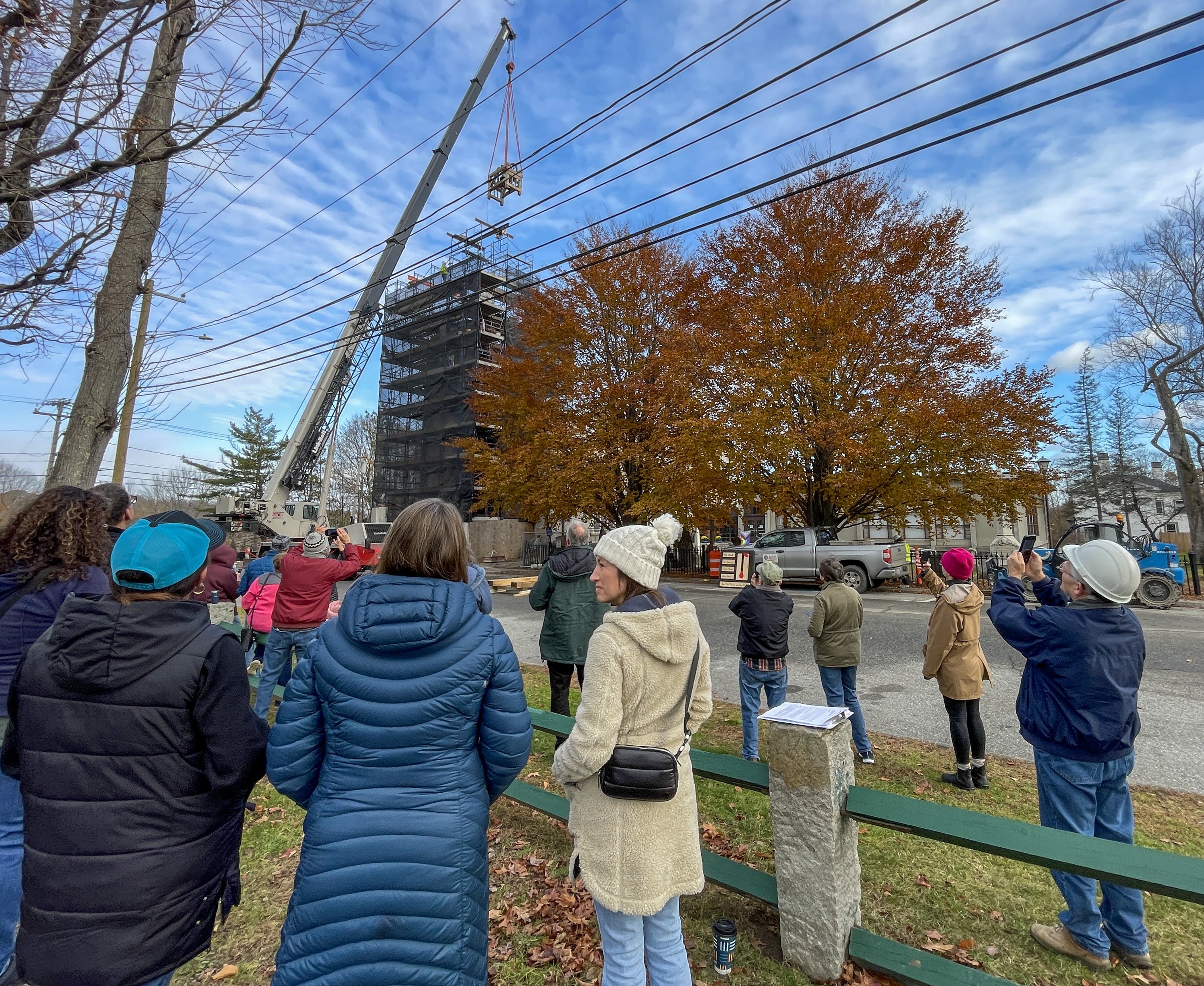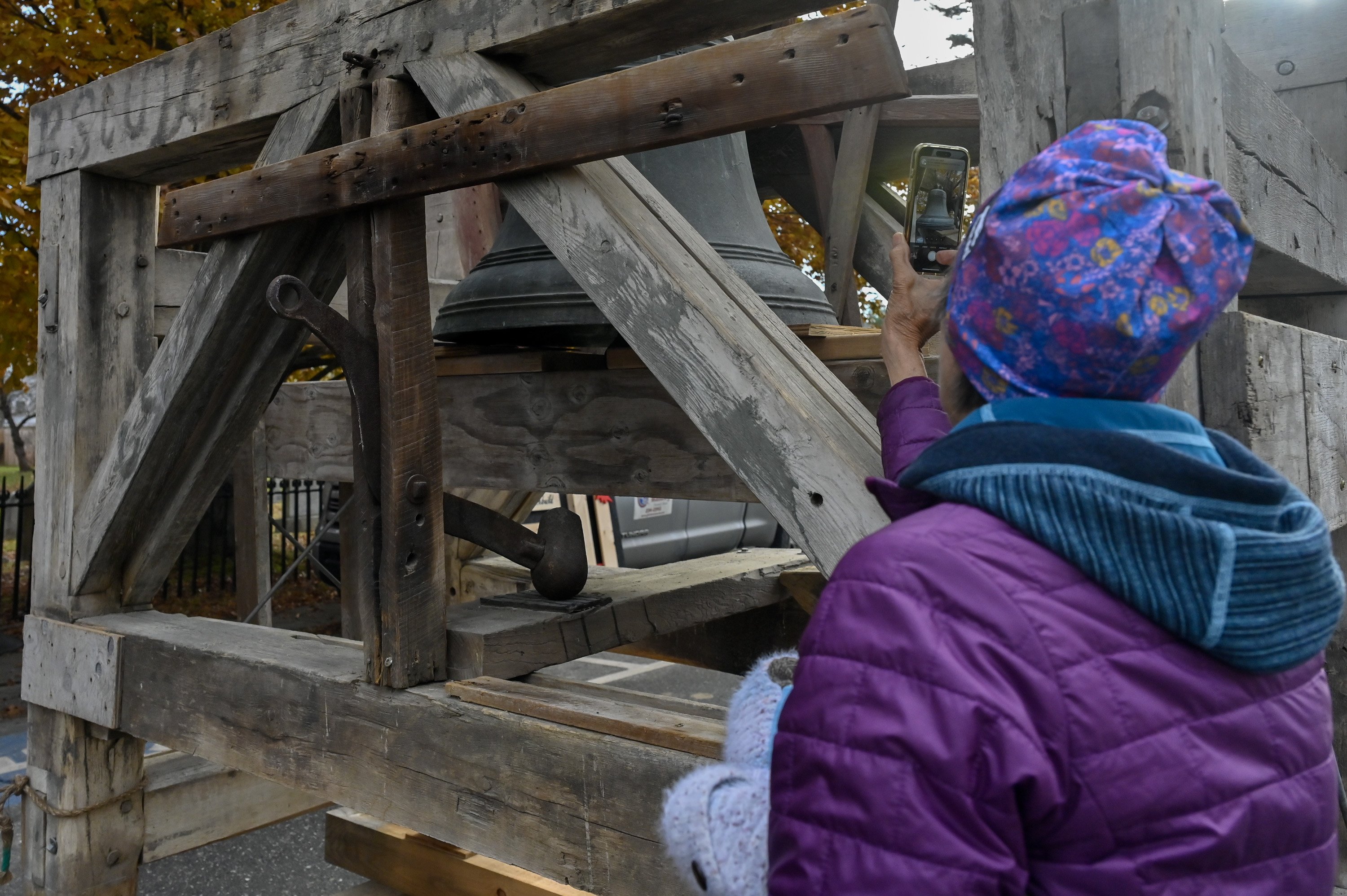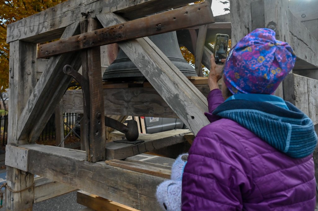 Revere and Son bell before it was lifted back up into the repaired bell tower Friday at the Christ Episcopal Church on Gardiner Common in Gardiner. The church was built on Gardiner Common in 1820 when the Paul Revere and Son bell was installed. Holly Burnes photographs the bell Friday November 14, 2025 before a crane lifted it into the bell town at the Christ Episcopal Church on Gardiner Common in Gardiner. The bell tower renovations started in April and the planned to be done before Christmas, according to The Rev. Kerry Mansir, Rector of Christ Episcopal Church. Gary Clendening reaches up and touches the bell Friday before a crane lifted it into the bell town at the Christ Episcopal Church on Gardiner Common in Gardiner. Workers attach straps to lift the Revere and Son bell back into repaired bell tower Friday at the Christ Episcopal Church. Rev. Kerry Mansir, Rector of the church said the spire and bell were removed so there would be less weight on the walls while the tower was being repaired so the spire and bell were removed. People watch and record the Revere and Son bell being lifted into repaired bell tower Friday. The Rev. Kerry Mansir, Rector of Christ Episcopal Church said the original plan was to put a support around the tower and repair it in place. But upon further inspection they found that the tower’s structural integrity was worse than expected and wall were so deteriorated that they couldn’t safely do it that way. People watch the Revere and Son bell being lifted into repaired bell tower Friday at the Christ Episcopal Church.People record the Revere and Son bell being lifted into repaired bell tower Friday at the Christ Episcopal Church. “It was supposed to be a million dollar project. We don’t have final numbers on the additional work because the design of the spire and what the materials will cost,” Rev. Kerry Mansir, Rector of Christ Episcopal Church, said. They’re estimating it will be an additional $500,000 to $600,000 all together, they’ll need to raise about another $400,000 to replace the spire.