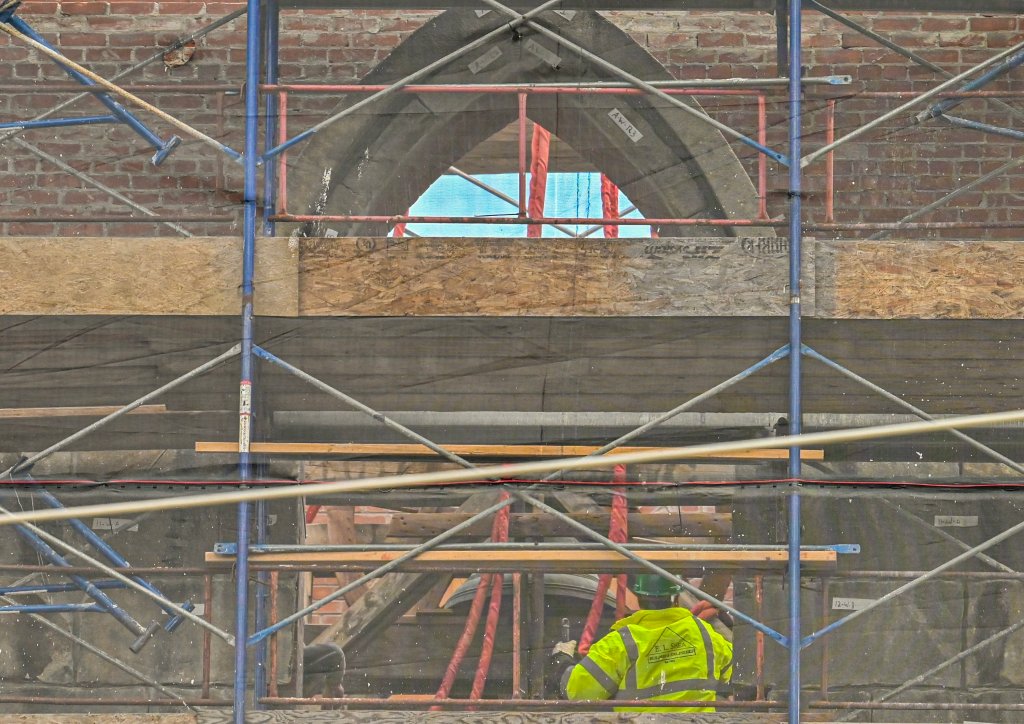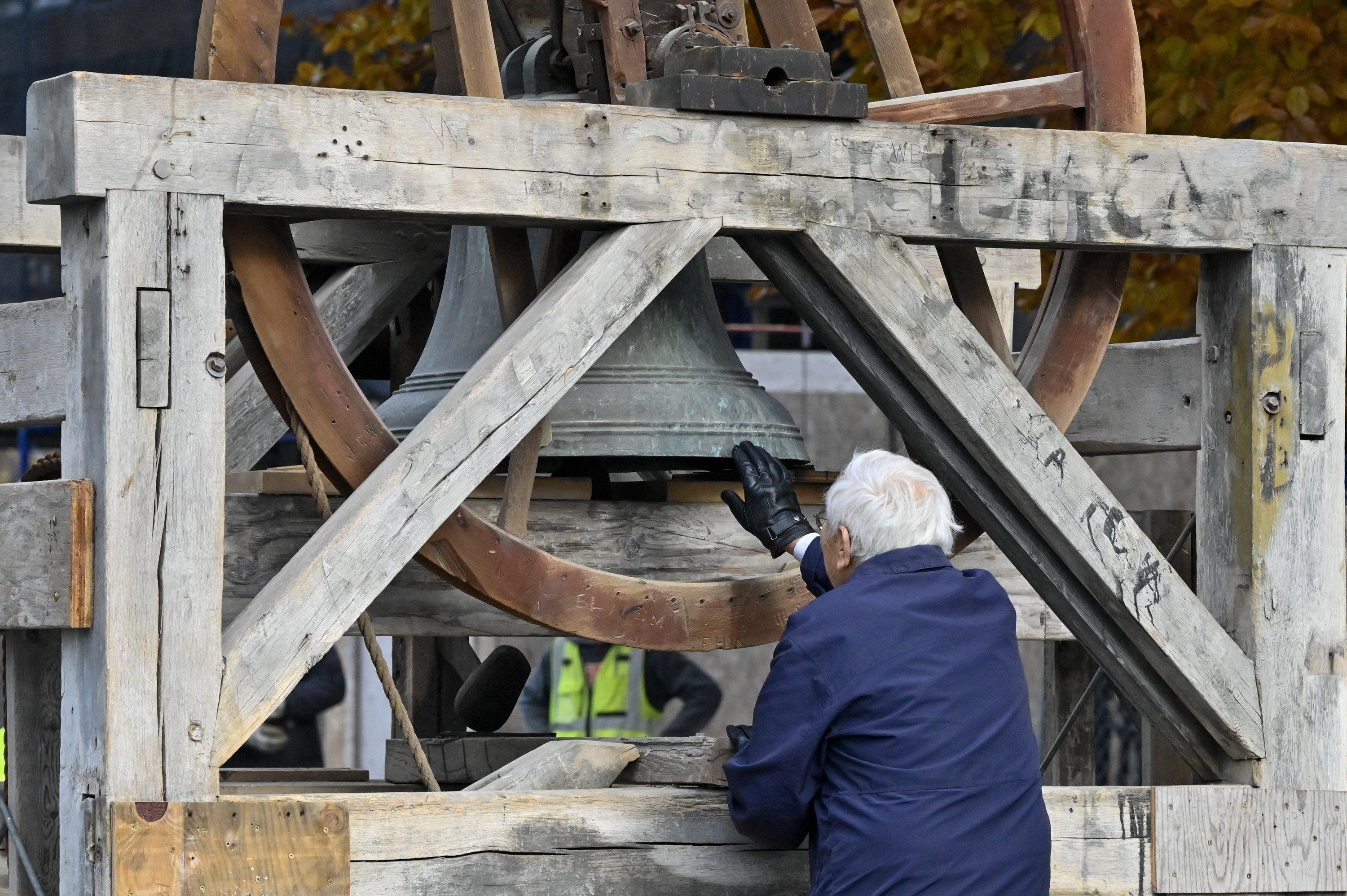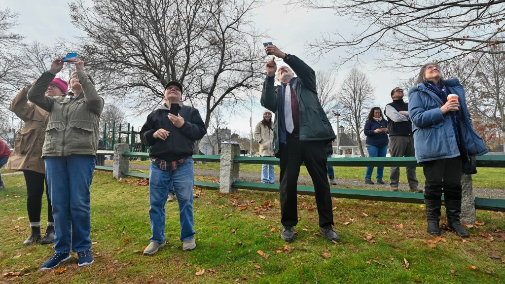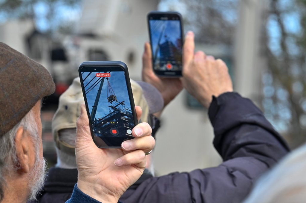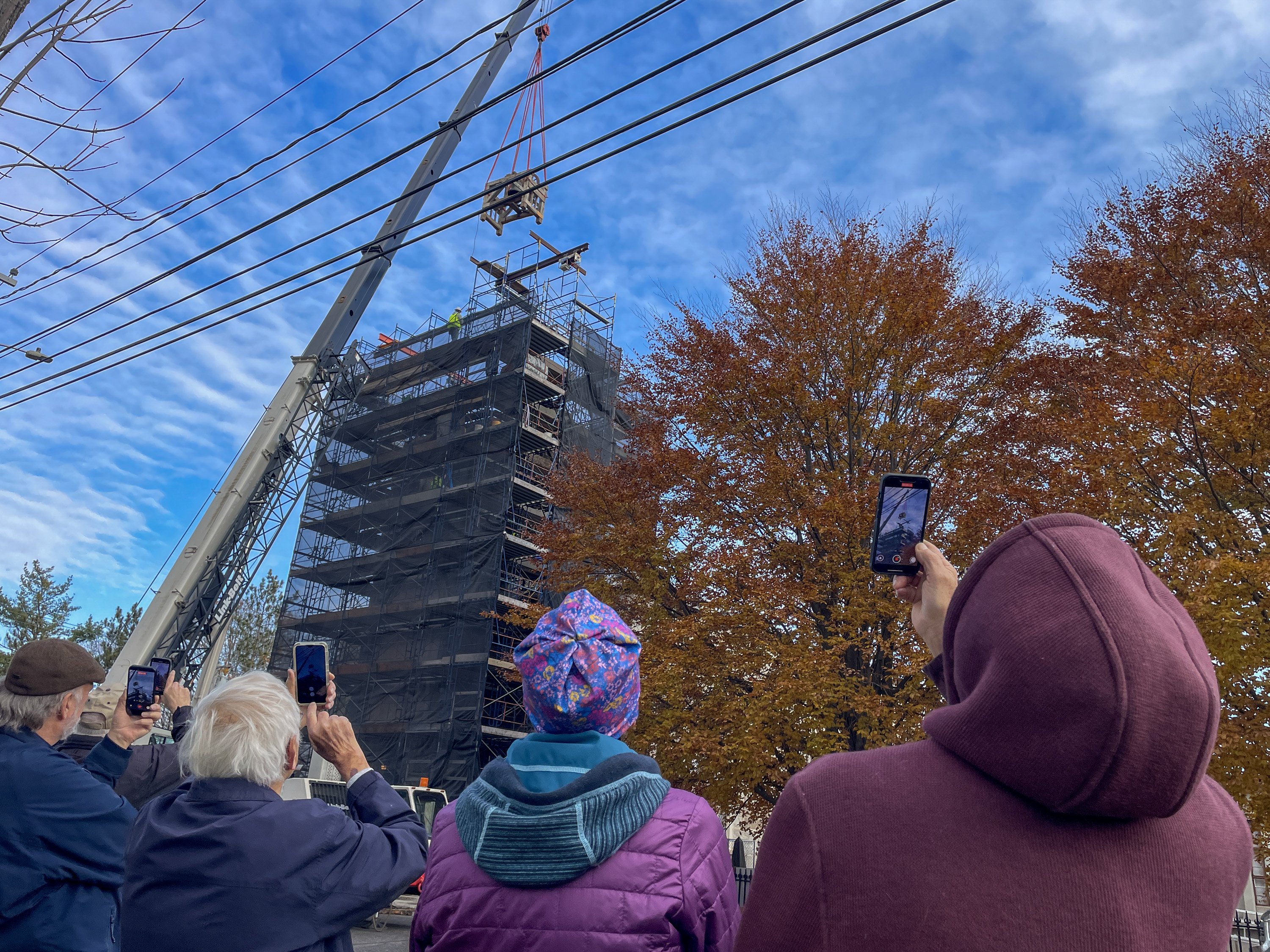 Revere and Son bell before it was lifted back up into the repaired bell tower Friday at the Christ Episcopal Church on Gardiner Common in Gardiner. The church was built on Gardiner Common in 1820 when the Paul Revere and Son bell was installed. Holly Burnes photographs the bell Friday November 14, 2025 before a crane lifted it into the bell town at the Christ Episcopal Church on Gardiner Common in Gardiner. The bell tower renovations started in April and the planned to be done before Christmas, according to The Rev. Kerry Mansir, Rector of Christ Episcopal Church. Gary Clendening reaches up and touches the bell Friday before a crane lifted it into the bell town at the Christ Episcopal Church on Gardiner Common in Gardiner. Workers attach straps to lift the Revere and Son bell back into repaired bell tower Friday at the Christ Episcopal Church. Rev. Kerry Mansir, Rector of the church said the spire and bell were removed so there would be less weight on the walls while the tower was being repaired so the spire and bell were removed. People watch and record the Revere and Son bell being lifted into repaired bell tower Friday. The Rev. Kerry Mansir, Rector of Christ Episcopal Church said the original plan was to put a support around the tower and repair it in place. But upon further inspection they found that the tower’s structural integrity was worse than expected and wall were so deteriorated that they couldn’t safely do it that way. People watch the Revere and Son bell being lifted into repaired bell tower Friday at the Christ Episcopal Church.People record the Revere and Son bell being lifted into repaired bell tower Friday at the Christ Episcopal Church. “It was supposed to be a million dollar project. We don’t have final numbers on the additional work because the design of the spire and what the materials will cost,” Rev. Kerry Mansir, Rector of Christ Episcopal Church, said. They’re estimating it will be an additional $500,000 to $600,000 all together, they’ll need to raise about another $400,000 to replace the spire.