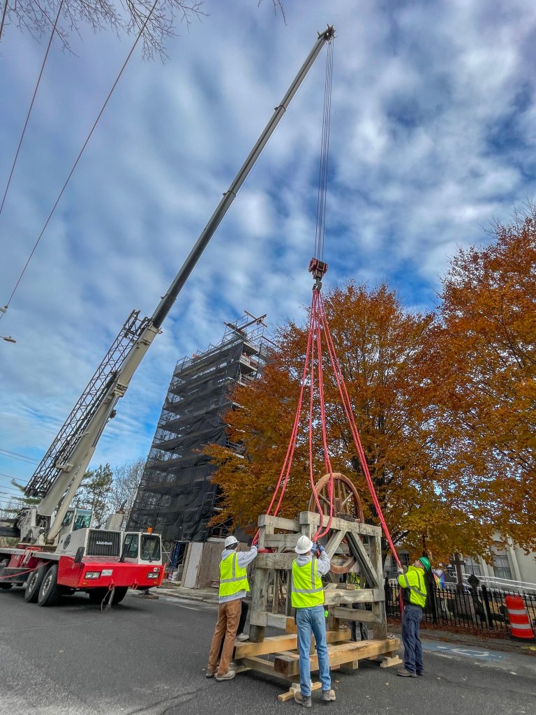 A crane lifts the Revere and Son bell back into repaired bell tower Friday at the Christ Episcopal Church