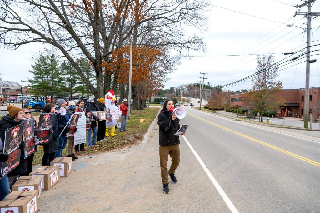 Among them was Fairfield resident Mary Bradstreet, who chanted and cheered from an inflatable chicken costume. The 56-year-old has been involved with Mercy for Animals’ Hannaford campaign since the summer and said a groundswell around the cage issue has seemed to be growing “little by little” for months.