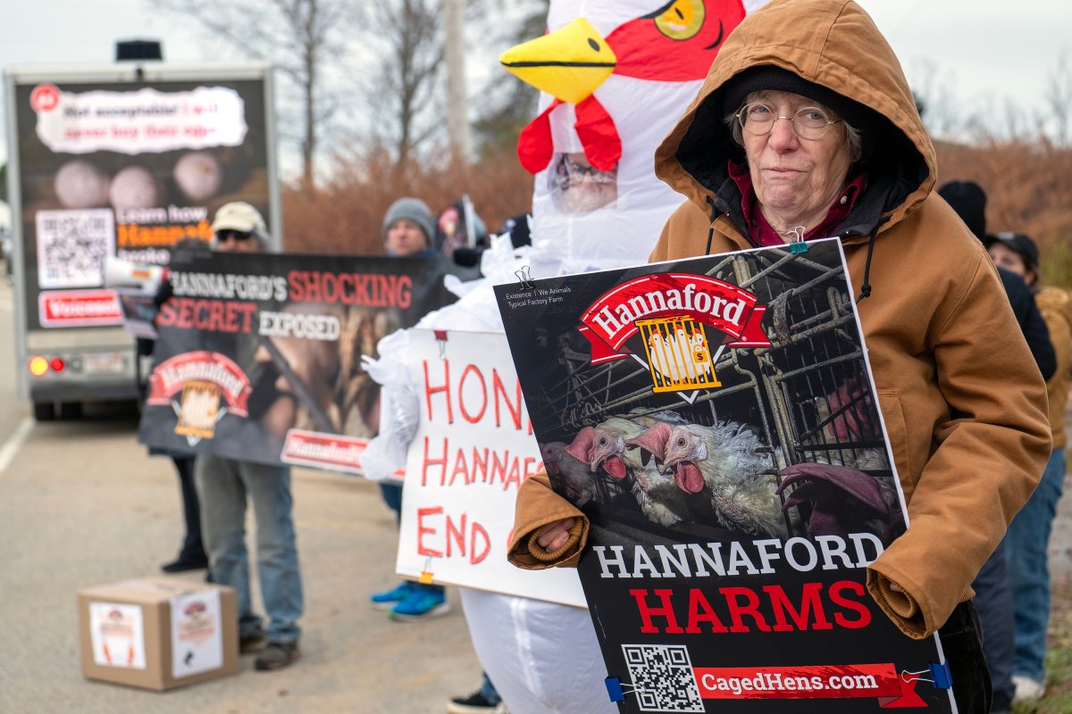 SCARBOROUGH — Animal rights demonstrators descended upon Hannaford Supermarkets’ headquarters Monday, demanding increased urgency and transparency in the company’s transition to all cage-free eggs.
