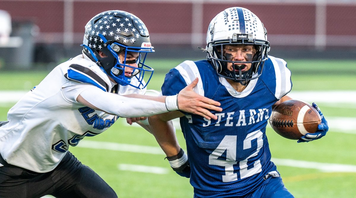 Stearns running back Lucas Pelkey barrels down the sideline as Old Orchard Beach's Trot Moody tries to tackle him. (Russ Dillingham/Staff Photographer)