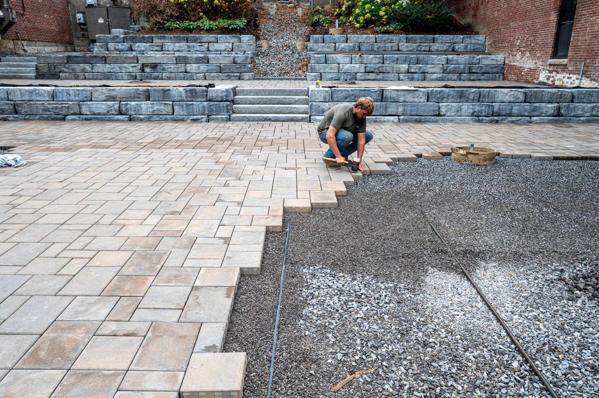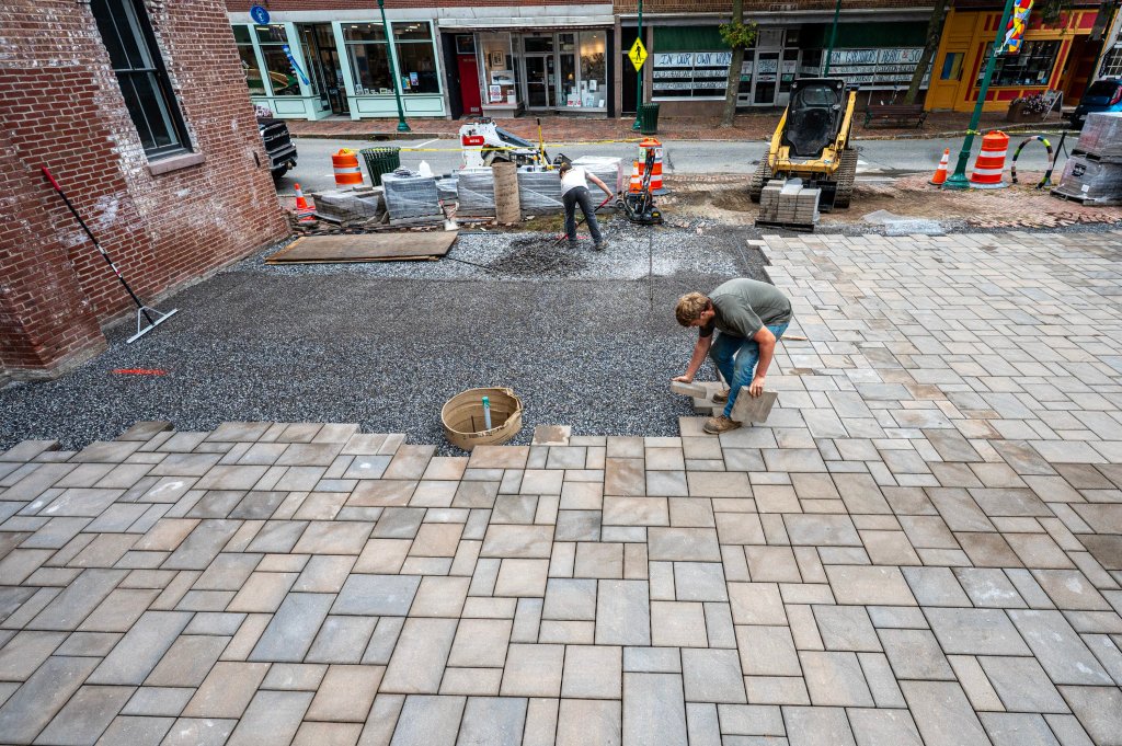 A view of the park from Mechanic Street shows construction June 7, at left, and Oct. 28, right, in downtown Gardiner. Upgrades include new stairways with handrails, stabilized paver surfaces, improved lighting, and enhanced landscaping to create a safer and more inviting space. (Staff photo by Joe Phelan/Staff Photographer)
